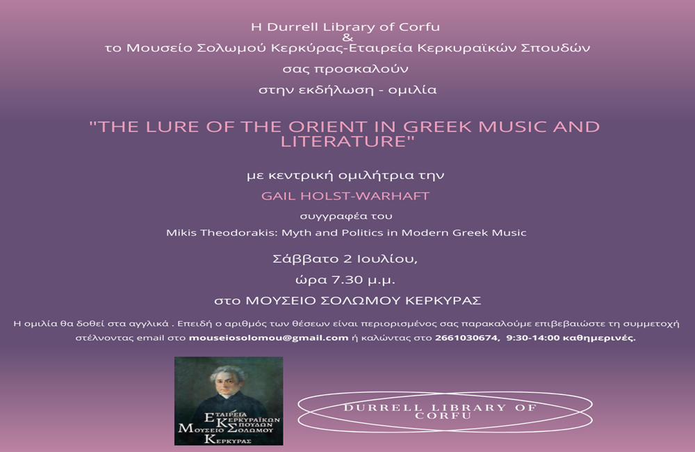 Το Σάββατο 2 Ιουλίου 2022 και ώρα 7.30 μ.μ. θα φιλοξενηθεί στο Μουσείο Σολωμού (με αίτημα της Βιβλιοθήκης Durrell) η κ. Gail Holst-Warhaft (Γκέιλ Χολστ- Βάρχαφτ), η οποία θα μιλήσει με θέμα: “The Lure of the Orient in Greek Music and Literature”. Πιο συγκεκριμένα, η κ. Gail Holst-Warhaft θα μιλήσει για την πρόσληψη της «Ανατολής» από συγγραφείς όπως ο Νίκος Καζαντζάκης, ο Γιώργος Σεφέρης και ο Άγγελος Σικελιανός, πριν επικεντρωθεί στο ρεμπέτικο και στη μουσική του Μίκη Θεοδωράκη – και ιδιαίτερα στην εκ νέου ανακάλυψη της μουσικής κληρονομιάς της γενέτειρας της μητέρας του Ασπασίας Πουλάκη στο Ҫeşme [Κρήνη] στη Μικρά Ασία. Η ομιλία θα πλαισιωθεί με μουσικά παραδείγματα των έργων του Μίκη Θεοδωράκη. Η είσοδος θα είναι ελεύθερη, με προτίμηση ηλεκτρονικής επιβεβαίωσης συμμετοχής, λόγω των περιορισμένων θέσεων, στην ηλεκτρονική διεύθυνση της Εταιρείας Κερκυραϊκών Σπουδών mouseiosolomou@gmail.com, ή με τηλεφώνημα στο 2661030674, Δευτέρα έως Παρασκευή 9:30 π.μ. – 2:00 μ.μ. για επιβεβαίωση. Η διάλεξη θα πραγματοποιηθεί στα αγγλικά.