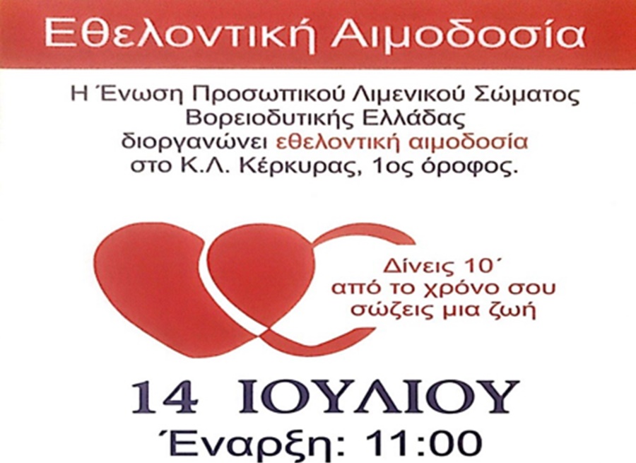 Η Ένωση Προσωπικού Λιμενικού Σώματος Βορειοδυτικής Ελλάδος διοργανώνει την Πέμπτη 14 Ιουλίου και ώρα 11:00 π.μ. εθελοντική αιμοδοσία στον 1ο όροφο του κτιρίου του Κεντρικού Λιμεναρχείου Κέρκυρας.
