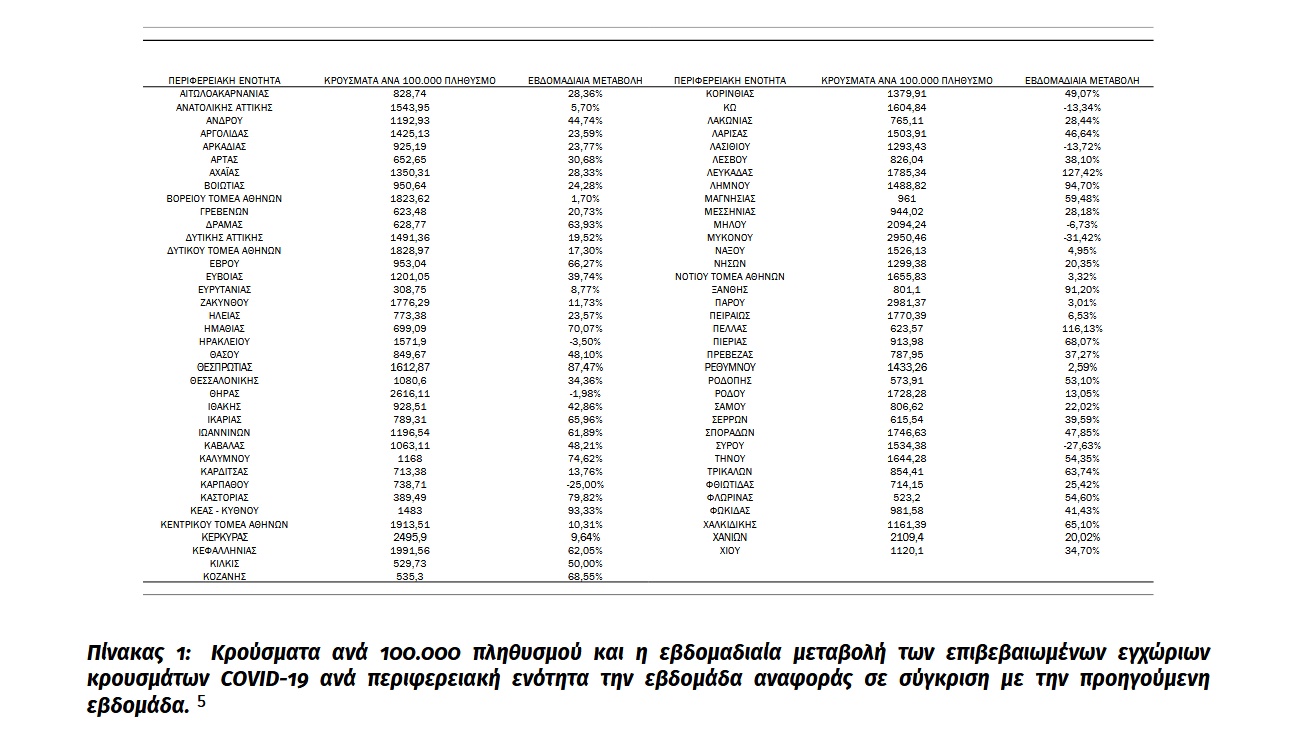 Μπορεί ο ΕΟΔΥ στην πρώτη εβδομαδιαία ανακοίνωσή του να μην ανέφερε τον αριθμό των κρουσμάτων ανά περιφερειακή ενότητα, εν αντιθέσει με ότι έπραττε στις καθημερινές ενημερώσεις του, ωστόσο, στον σχετικό πίνακα γνωστοποίησε τον αριθμό μολύνσεων ανά 100.000 πληθυσμού.