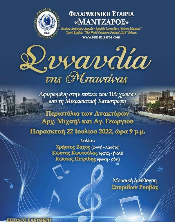 Η Μπαντίνα της «Φιλαρμονικής Εταιρίας Μαντζαρος» πραγματοποιεί την καθιερωμένη ετήσια συναυλία της την Παρασκευή 22 Ιουλίου και ώρα 21:00, στο Περιστύλιο των Ανακτόρων Αρχαγγέλου Μιχάηλ & Αγίου Γεωργίου.