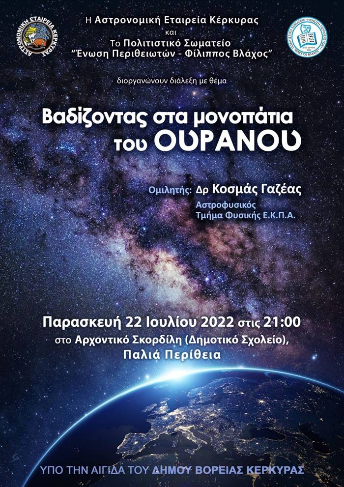 Η Αστρονομική Εταιρεία Κέρκυρας σε συνεργασία με το Πολιτιστικό Σωματείο « Ένωση Περιθειωτών – Φίλιππος Βλάχος» διοργανώνουν διάλεξη για το ευρύ κοινό με θέμα ”Βαδίζοντας στα Μονοπάτια του Ουρανού”