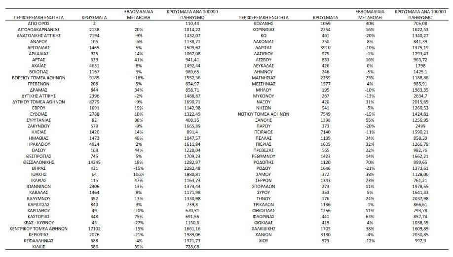 Αναλυτικά, η διασπορά του κορονοϊού ανά περιφερειακή ενότητα την τελευταία εβδομάδα: