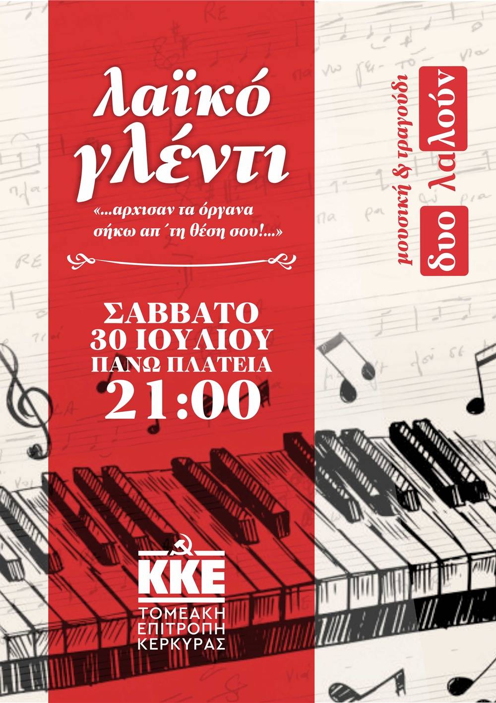 Το Σάββατο 30 Ιουλίου στις 9 το βράδυ, η Τομεακή Επιτροπή Κέρκυρας του ΚΚΕ οργανώνει λαϊκό γλέντι στην Πάνω Πλατεία.