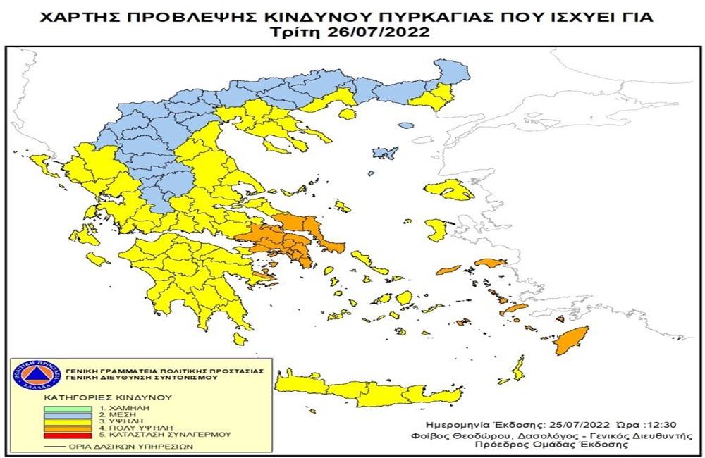 Το Πυροσβεστικό Σώμα Ελλάδας έδωσε στη δημοσιότητα τον χάρτη Πρόβλεψης Κινδύνου Πυρκαγιάς για την Τρίτη Τρίτη 26/7.