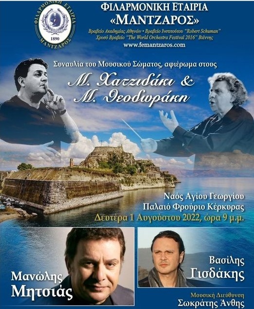 Την Δευτέρα 1η Αυγούστου 2022 και ώρα 21:00μμ, μπροστά από τον Ι.Ν. του Αγίου Γεωργίου Παλαιού Φρουρίου, το Μουσικό Σώμα της Φιλαρμονικής Εταιρίας «Μάντζαρος» πραγματοποιεί μεγάλη συναυλία – αφιέρωμα στους μέγιστους Έλληνες συνθέτες Μάνο Χατζιδάκι και Μίκη Θεοδωράκη.