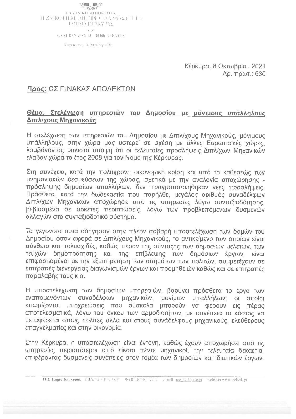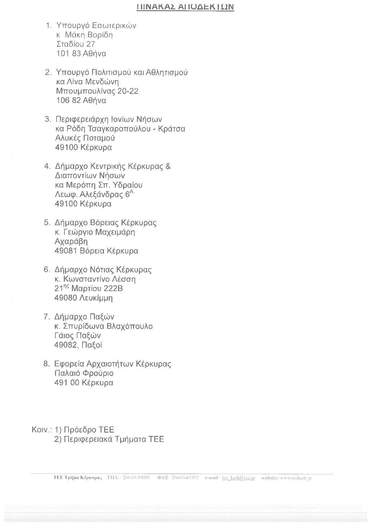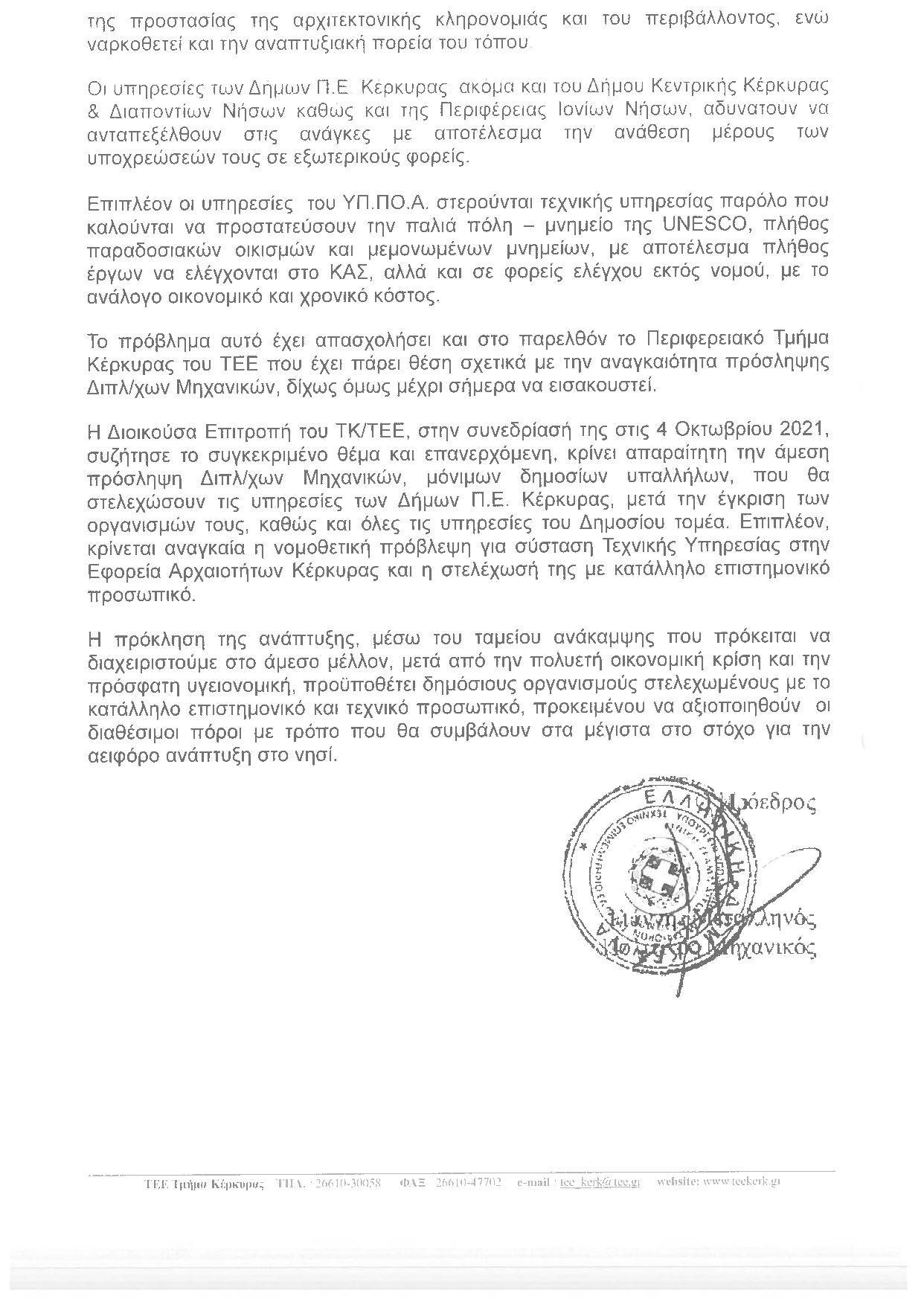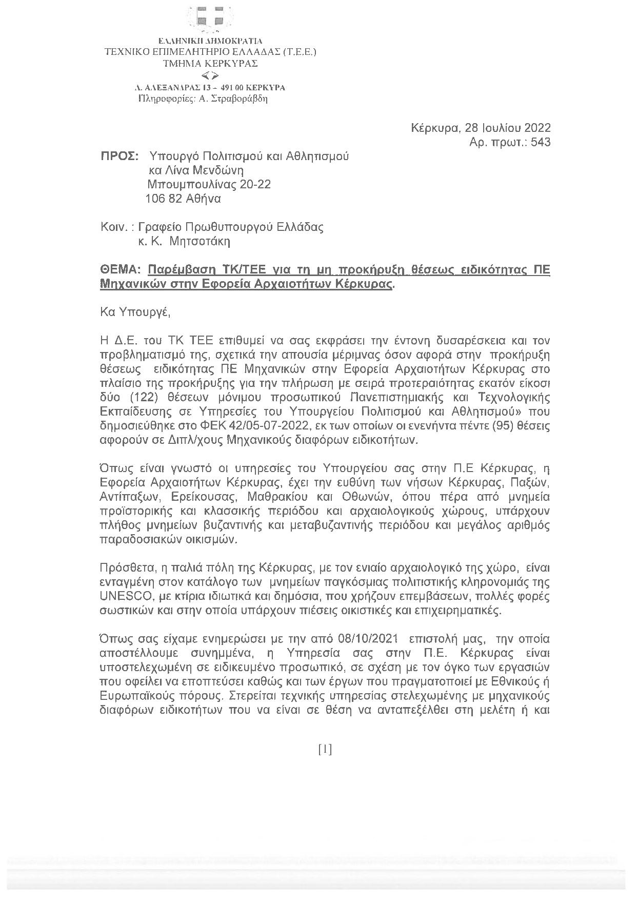 Παρέμβαση του Π. Τμήματος Κέρκυρας προς την Υπουργό Πολιτισμού και Αθλητισμού Λ. Μενδώνη αναφορικά με τη μη προκήρυξη θέσεως ειδικότητας ΠΕ Μηχανικών στην Εφορεία Αρχαιοτήτων Κέρκυρας στο πλαίσιο της προκήρυξης για την πλήρωση με σειρά προτεραιότητας 122 θέσεων μόνιμου προσωπικού Πανεπιστημιακής και Τεχνολογικής Εκπαίδευσης σε Υπηρεσίες του Υπουργείου Πολιτισμού και Αθλητισμού.