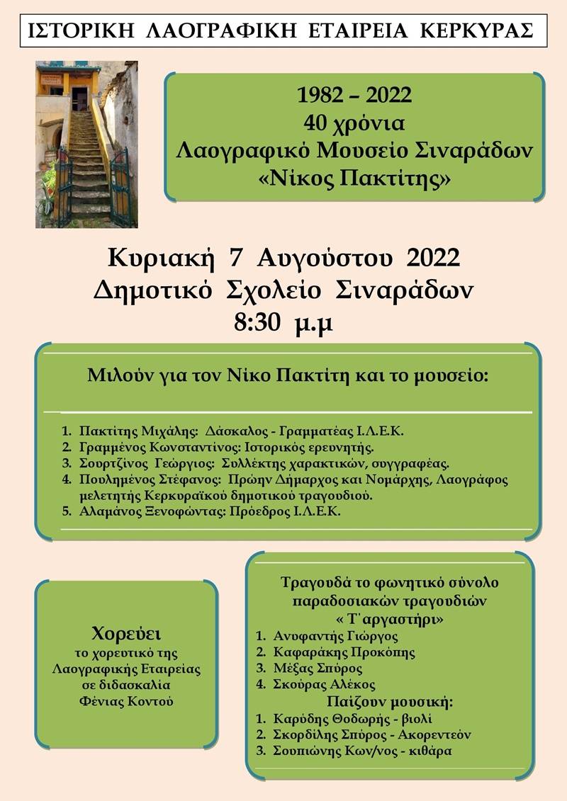 Η ιστορική λαογραφική εταιρεία Κέρκυρας διοργανώνει εκδήλωση για τα 40 χρόνια Λαογραφικό Μουσείο Σιναράδων «Νίκος Πακτίτης» 1982 – 2022, την Κυριακή 7 Αυγούστου στο Δημοτικό Σχολείο Σιναράδων στις 8:30 μ.μ
