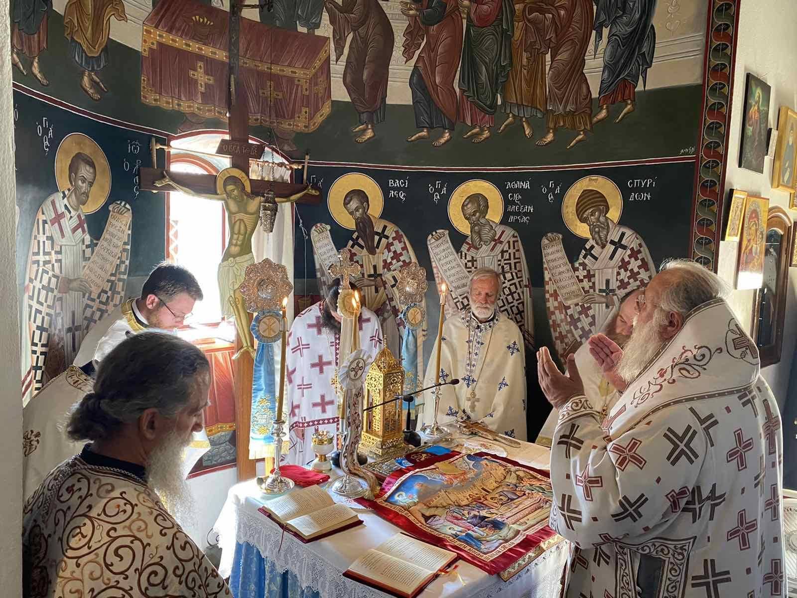 Κατά την Θεία Λειτουργία, ο Σεβασμιώτατος αναφέρθηκε στο γεγονός της Θείας Μεταμορφώσεως, ο οποίος υπογράμμισε ότι στην παρούσα εορτή δεν έχουμε μόνον πρωταγωνιστή τον Τριαδικό Θεό, αλλά έχουμε και ανθρώπους κοντά Του, που σηματοδοτούν το πέρασμα από την Παλαιά στην Καινή Διαθήκη, από την περίοδο του Νόμου, στην περίοδο της Θείας Χάριτος. Ο Μωυσής και ο Ηλίας, εκπρόσωποι των κεκοιμημένων και των ζώντων, εκπρόσωποι του Νόμου και των Προφητών, που αξιώθηκαν να συνομιλήσουν με τον Θεό «ενώπιος ενωπίω» στην Παλαιά Διαθήκη από την μια μεριά, και οι τρείς εκ των προκρίτων μαθητών, ο Πέτρος, ο Ιάκωβος και ο Ιωάννης, εκπρόσωποι της ανθρωπότητας που ζει την Θεία χάρη της Καινής Διαθήκης από την άλλη πλευρά. Αυτοί μας δείχνουν ότι κληθήκαμε να συνομιλήσουμε με τον Θεό. Μας δείχνουν ότι η πορεία της ζωής μας δεν είναι να μένουμε στα παρόντα, στα βιοτικά, στις ηδονές και στις οδύνες της ζωής μας, αλλά να ζήσουμε μεταμορφωμένοι με τον Κύριο μας σε μια οντολογική σχέση, η οποία είναι η ανώτατη θέση του ανθρώπου που δημιουργήθηκε από τον Θεό. Ο Μωυσής που κλήθηκε από τον Θεό δύο φορές για να οδηγήσει τον ηγαπημένο Του λαό στην ελευθερία από την δουλεία, αφενός μεν του αποκαλύφθηκε στο Σινά, στην καιομένη βάτο, και του συστήθηκε λέγοντας Του ότι «εγώ ειμί ο Ων», και ξανά οδηγώντας τον λαό στο ίδιο σημείο του Σινά, καλείται από τον Θεό να λάβει το Νόμο και να ατενίσει την δόξα Του, με κεκαλυμμένη την κεφαλή, διότι την δόξα του Θεού, δεν θα μπορούσε να την αντέξει με ακάλυπτη την κεφαλή του. Και όταν κατεβαίνει κρατώντας τον Νόμο του Θεού συνεχίζει να φέρει το κάλυμμα επί της κεφαλής διότι αυτή η δόξα του Θεού, ήταν αποτυπωμένη στο πρόσωπο του. Και ο Προφήτης Ηλίας στο διπλανό όρος, Χωρίβ, κλήθηκε από τον Θεό μετά από τις διώξεις και τις ταπεινώσεις από τους ειδωλολάτρες βασιλείς, να γνωρίσει τον Θεό και εκεί τον γνώρισε ως λεπτή αύρα που δροσίζει και αγιάζει. Και τούτο διότι η φωνή του Θεού είναι η φωνή που λυτρώνει τον προφήτη από την μοναξιά, από την κόπωση και την απόγνωση. Δείχνει δηλαδή ο Θεός στον άνθρωπο ότι τον έπλασε για να είναι μαζί του, και να κοινωνεί την αγάπη του Θεού και την αιωνιότητα. Καθώς και ότι ο θάνατος του κακού, της μοναξιάς, της λύπης, δεν υπάρχει σ αυτόν που ζει την παρουσία του Θεού. Στην εορτή της μεταμορφώσεως οι δύο πρωταγωνιστές της Παλαιάς Διαθήκης θα συναντηθούν με τους τρεις μαθητές, μόνο που τώρα η κοινωνία Θεού και ανθρώπων δεν είναι κεκαλυμμένου προσώπου.