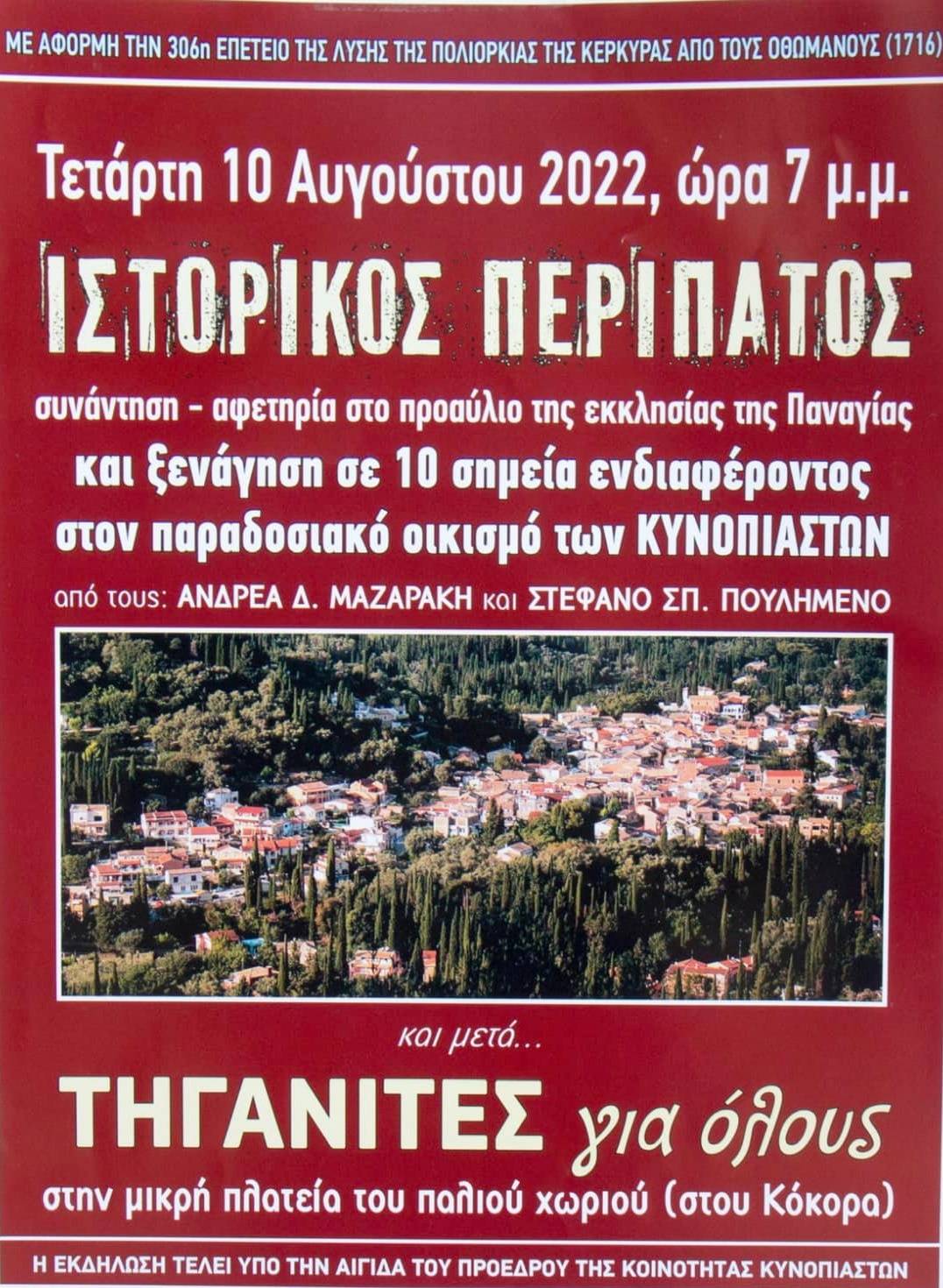 Εκδήλωση στους Κυνοπιάστες στις 10 Αυγούστου, που περιλαμβάνει περίπατο σε ιστορικά σημεία του χωριού αλλά και δωρεάν τηγανίτες.