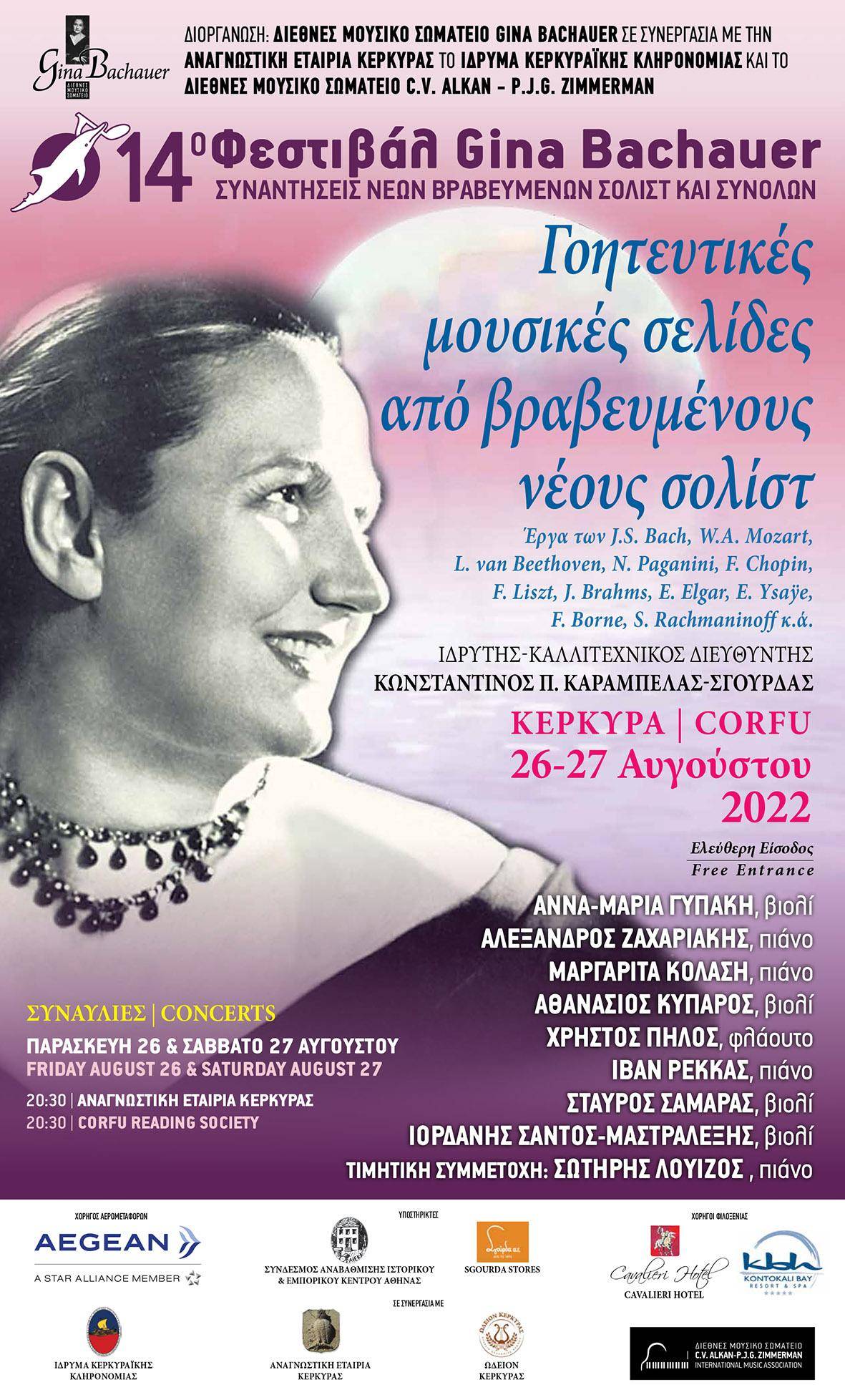 Με ιδιαίτερη χαρά παρουσιάζουμε το 14o ΦΕΣΤΙΒΑΛ GINA BACHAUER, που διοργανώνεται στην Κέρκυρα από το ΔΙΕΘΝΕΣ ΜΟΥΣΙΚΟ ΣΩΜΑΤΕΙΟ GINA BACHAUER σε συνεργασία με την ΑΝΑΓΝΩΣΤΙΚΗ ΕΤΑΙΡΙΑ ΚΕΡΚΥΡΑΣ, το ΙΔΡΥΜΑ ΚΕΡΚΥΡΑΪΚΗΣ ΚΛΗΡΟΝΟΜΙΑΣ, το ΔΙΕΘΝΕΣ ΜΟΥΣΙΚΟ ΣΩΜΑΤΕΙΟ C.V. ALKAN-P.J.G. ZIMMERMAN, τον ΠΑΝΕΛΛΗΝΙΟ ΜΟΥΣΙΚΟ ΔΙΑΓΩΝΙΣΜΟ ΜΑΡΙΑΣ ΧΑΙΡΟΓΙΩΡΓΟΥ-ΣΙΓΑΡΑ και το ΩΔΕΙΟΝ ΚΕΡΚΥΡΑΣ.