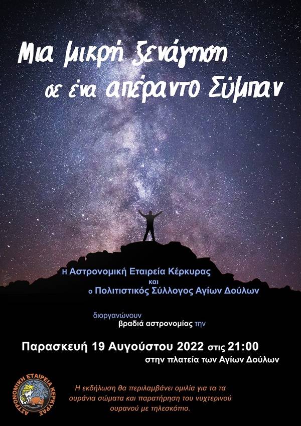 Η Αστρονομική Εταιρεία Κέρκυρας σε συνεργασία με τον Πολιτιστικό Σύλλογο Αγίων Δούλων διοργανώνουν εκδήλωση για το ευρύ κοινό με θέμα: ”Μια μικρή ξενάγηση σε ένα απέραντο Σύμπαν” την Παρασκευή 19 Αυγούστου στις 21:00, στην πλατεία των Αγίων Δούλων