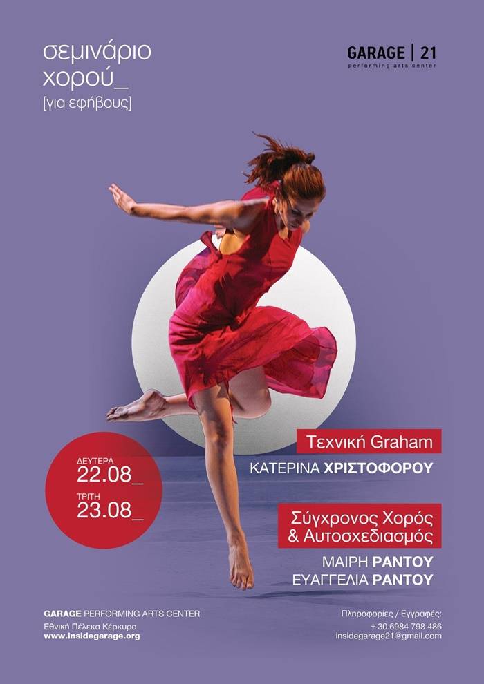 Το Garage Performing Arts Center σας προσκαλεί σε ένα 4ήμερο γεμάτο χορό για μικρούς και μεγάλους. Το Σαββατοκύριακο 20 & 21/08 ο Sammy Gian, χορευτής/χορογράφος απο την Κένυα, θα μας παρασύρει σε αφρικάνικους ρυθμούς, τη Δευτερα & Τρίτη 22, 23/08, η Κατερίνα Χριστοφόρου, χορεύτρια/δασκάλα χορού, θα μας εισαγάγει στον κόσμο της Martha Graham μέσω της τεχνικής της ενώ η Μάιρη & η Ευαγγελία Ράντου θα μας καθοδηγήσουν στον κόσμο του Σύγχρονου Χορού & του Αυτοσχεδιασμού.