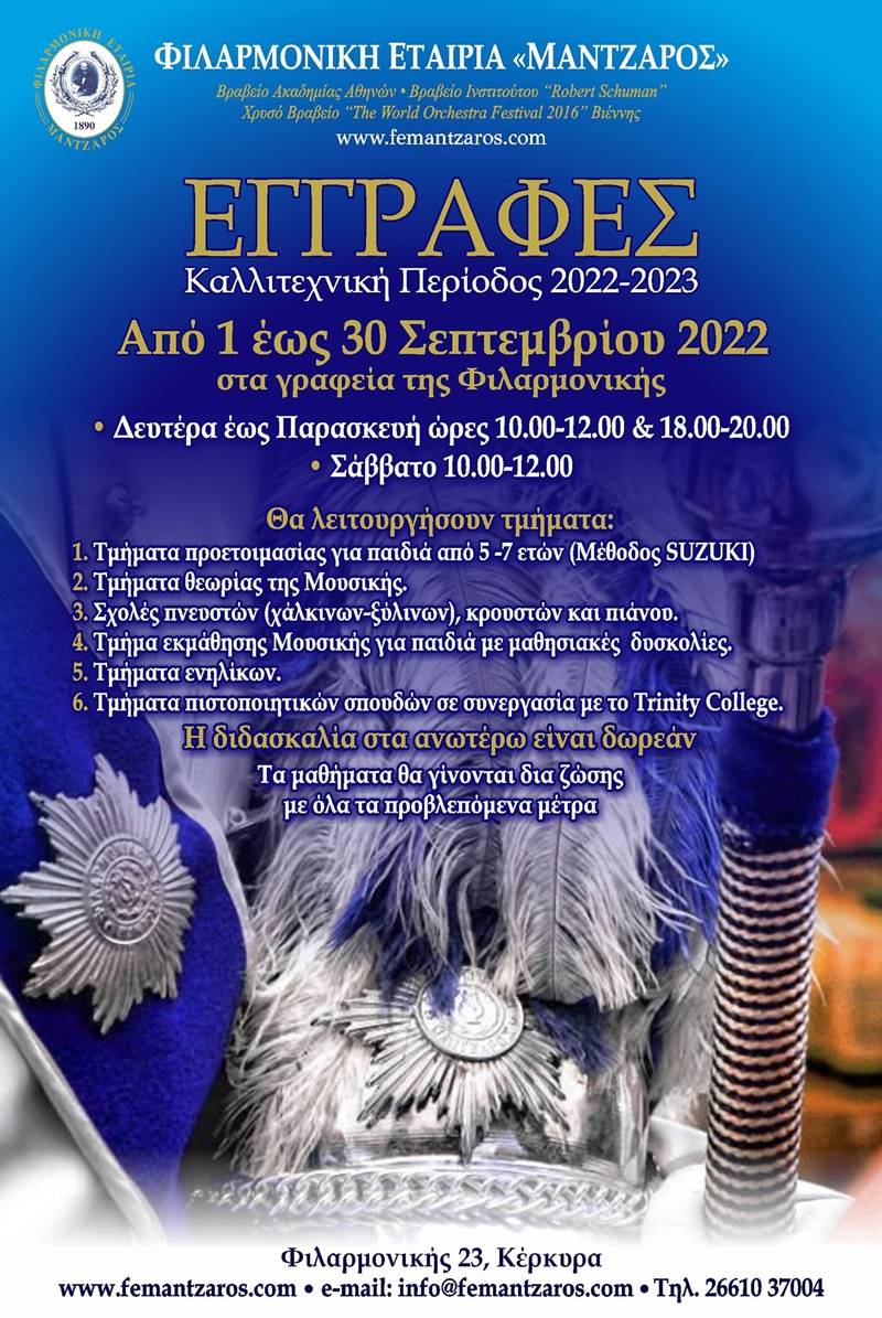 Η Φιλαρμονική Μάντζαρος ανακοινώνει ότι οι εγγραφές των μαθητών στην ΦΕΜ αρχίζουν την 01/09/2021 και θα διαρκέσουν έως και τις 30/09/2021.
