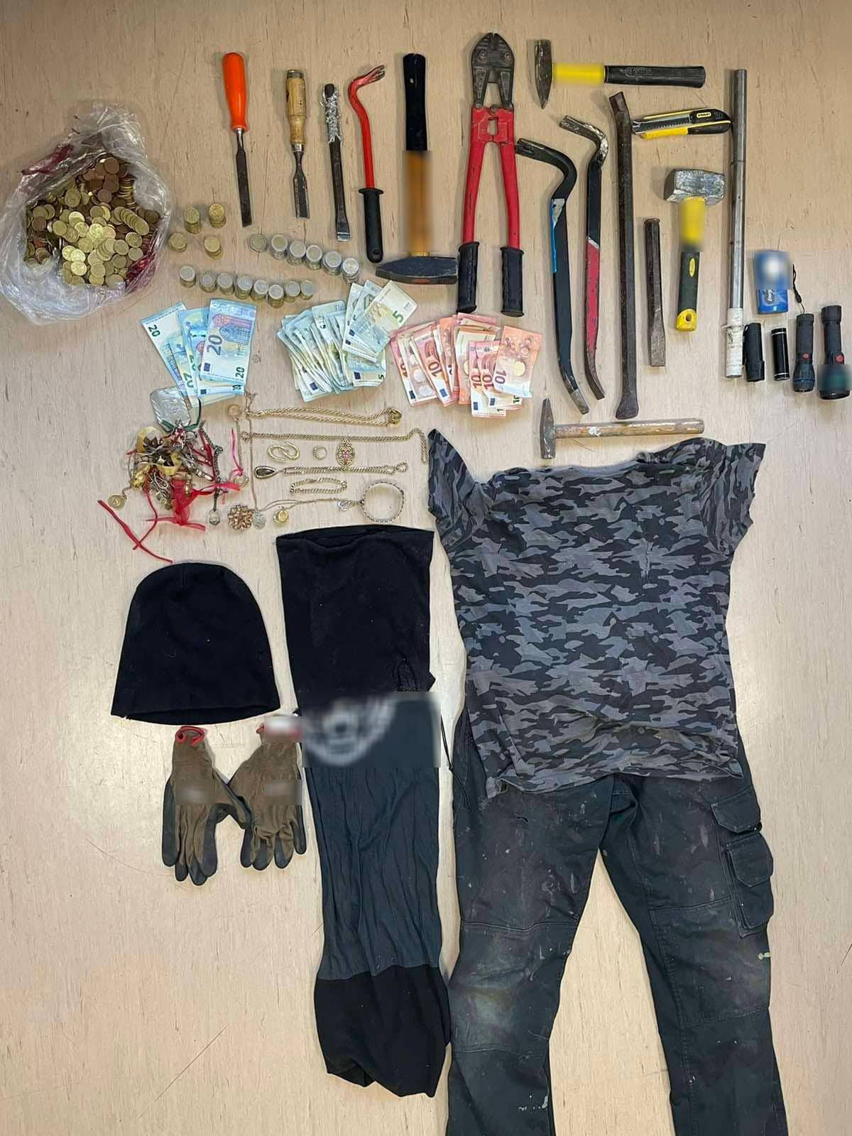 Ειδικότερα, μετά από αξιοποίηση πληροφοριακών δεδομένων, οργανώθηκε αστυνομική επιχείρηση στο πλαίσιο της οποίας, ο ανωτέρω, εντοπίσθηκε και συνελήφθη, σε περιοχή της νότιας Κέρκυρας και στο αυτοκίνητο που οδηγούσε βρέθηκαν και κατασχέθηκαν -αρχικά- διαρρηκτικά εργαλεία, κουκούλες και γάντια, το χρηματικό ποσό των -777.07- (σε χαρτονομίσματα και κέρματα) και πλήθος ταμάτων από πιστούς (αλυσίδες, βραχιόλια, σταυροί, σκουλαρίκια, διάφορα κρεμαστά και άλλα χρυσαφικά), τα οποία, όπως προέκυψε, είχε αφαιρέσει, λίγη ώρα πριν, από Ιερό Ναό στα Μωραΐτικα Κέρκυρας.