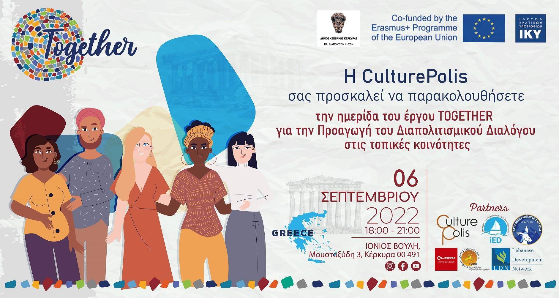 Η CulturePolis αστική μη κερδοσκοπική εταιρία (α.μ.κ.ε) με έδρα την Κέρκυρα διοργανώνει ημερίδα με θέμα την «Προαγωγή του Διαπολιτισμικού Διαλόγου στις τοπικές κοινότητες», την Τρίτη 6 Σεπτεμβρίου 2022, στις 18.00 μ.μ., στην αίθουσα της Ιονίου Βουλής και τελεί υπό την αιγίδα του Δήμου Κεντρικής Κέρκυρας και Διαποντίων Νήσων.