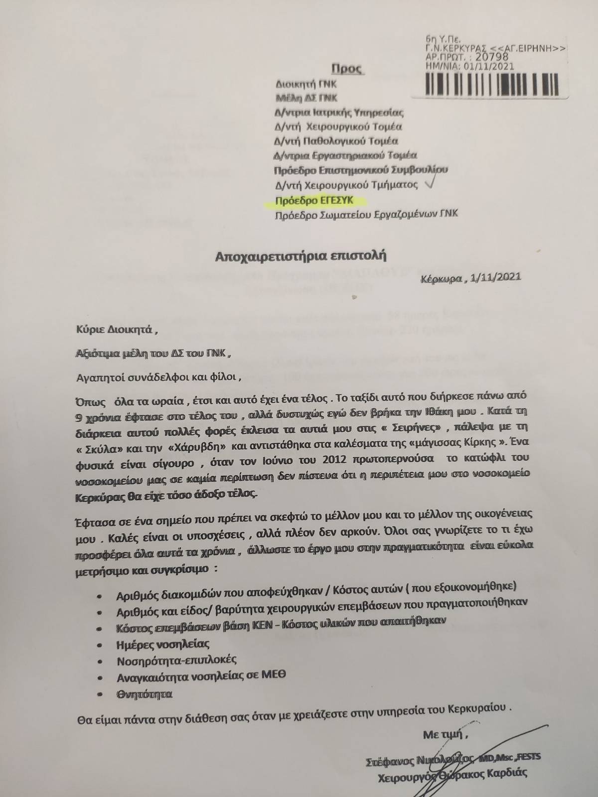Η δε Διοίκηση ενώ είχε εγκρίνει την αλλαγή του οργανισμού κατάφερε… να φύγει ο θωρακοχειρουργός! ΘΕΡΜΑ ΣΥΓΧΑΡΗΤΗΡΙΑ!!! (συνημμένη επιστολή παραίτησης)