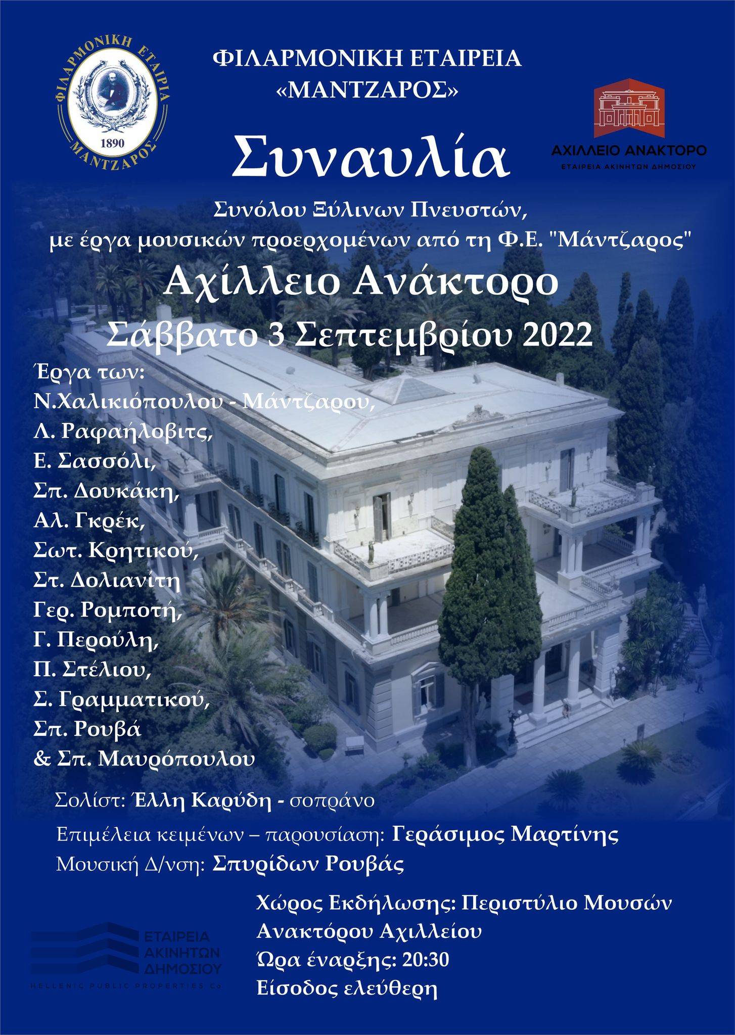 Η συναυλία πραγματοποιείται με την ευγενική συμβολή της Εταιρείας Ακινήτων Δημοσίου (ΕΤΑΔ) και της Διεύθυνσης του Ανακτόρου Αχιλλείου, τις οποίες και ευχαριστούμε.