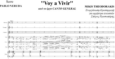 Αν ο θάνατος απειλούσε ήδη τον μεγάλο Έλληνα μουσουργό όταν έφτασε στο γραφείο του ο φάκελος με την ενδεικτική τρισέλιδη παρτιτούρα, ο Σ. Προσωπάρης θαρρείς κι επέλεξε συνειδητά, θα έλεγε κανείς, το κομμάτι «Voy a vivir» με το μήνυμα «Εγώ θα ζήσω». Γιατί βέβαια ο Μίκης Θεοδωράκης μάς συντροφεύει με το έργο του καθημερινά και το διεθνούς ακτινοβολίας «Canto General» θα ζήσει πολύ και θα φτάσει σε πολύ πιο πολλούς, μπορούμε να ισχυριστούμε, αν η Κέρκυρα αγκαλιάσει το σπουδαίο και δυσχερές εγχείρημα του Προσωπάρη.