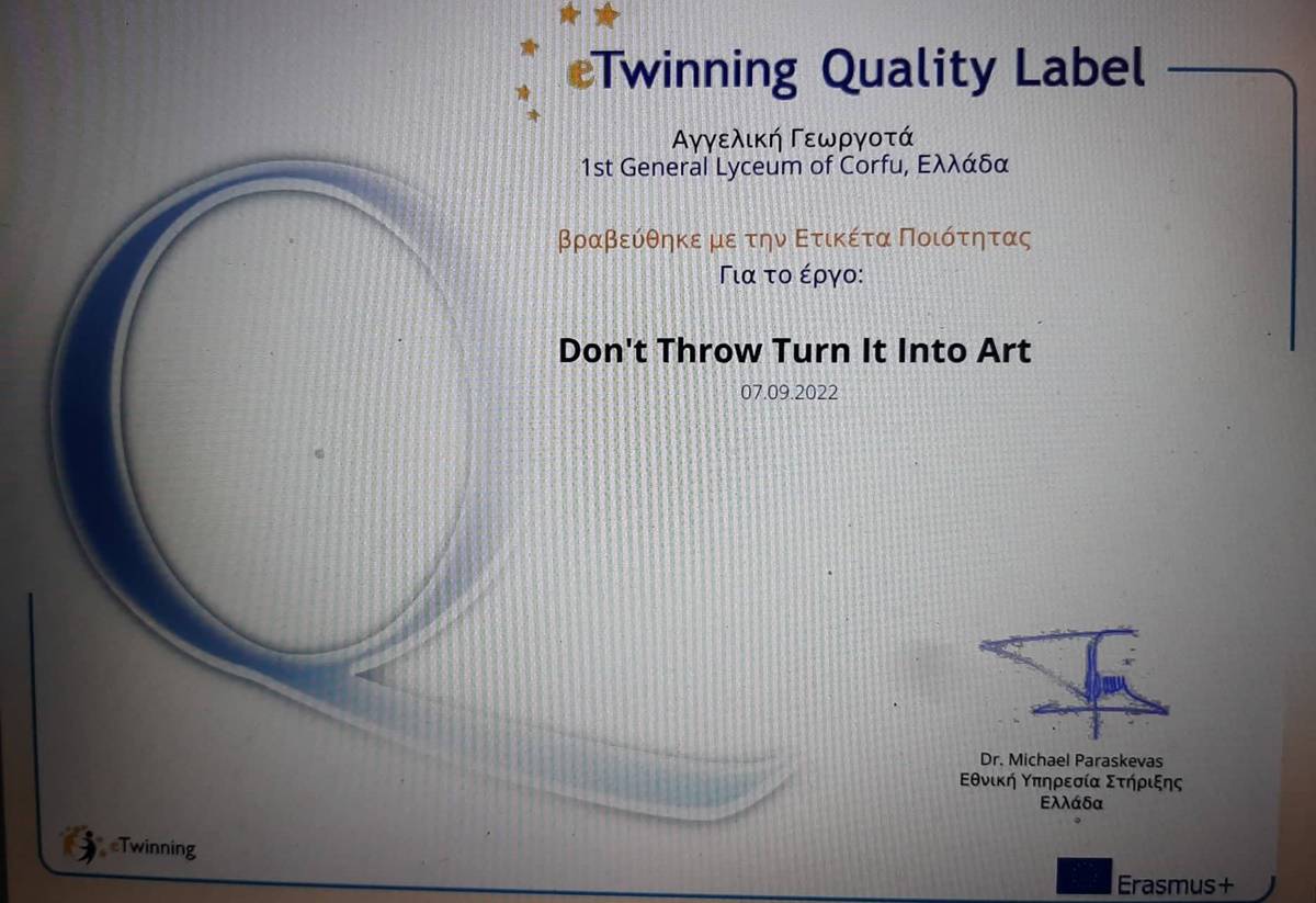 Το 1ο Γενικό Λύκειο Κέρκυρας βραβεύτηκε με την Εθνική Ετικέτα Ποιότητας e twining, για το εκπαιδευτικό πρόγραμμα που ολοκληρώθηκε κατά τη σχολική χρονιά 2021-2022, με τίτλο Don’t throw Turn It Into Art και υπεύθυνη καθηγήτρια τη φιλόλογο, Αγγελική Γεωργοτά.