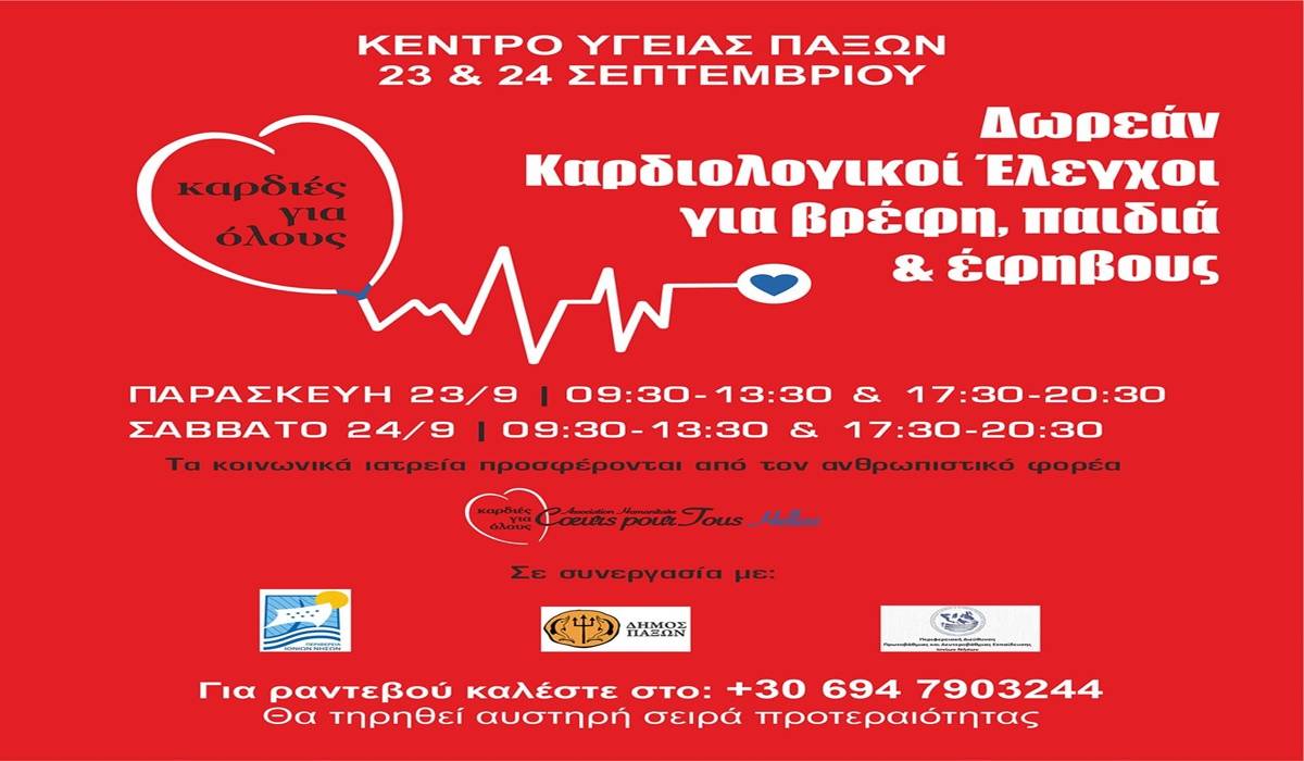 Η δράση, που θα λάβει χώρα στους Παξούς το διήμερο 23 και 24 Σεπτεμβρίου, μετά την πρωτοβουλία της Περιφέρειας Ιονίων Νήσων, αφορά δωρεάν καρδιολογικούς ελέγχους σε παιδιά από νεογνική έως και εφηβική ηλικία.