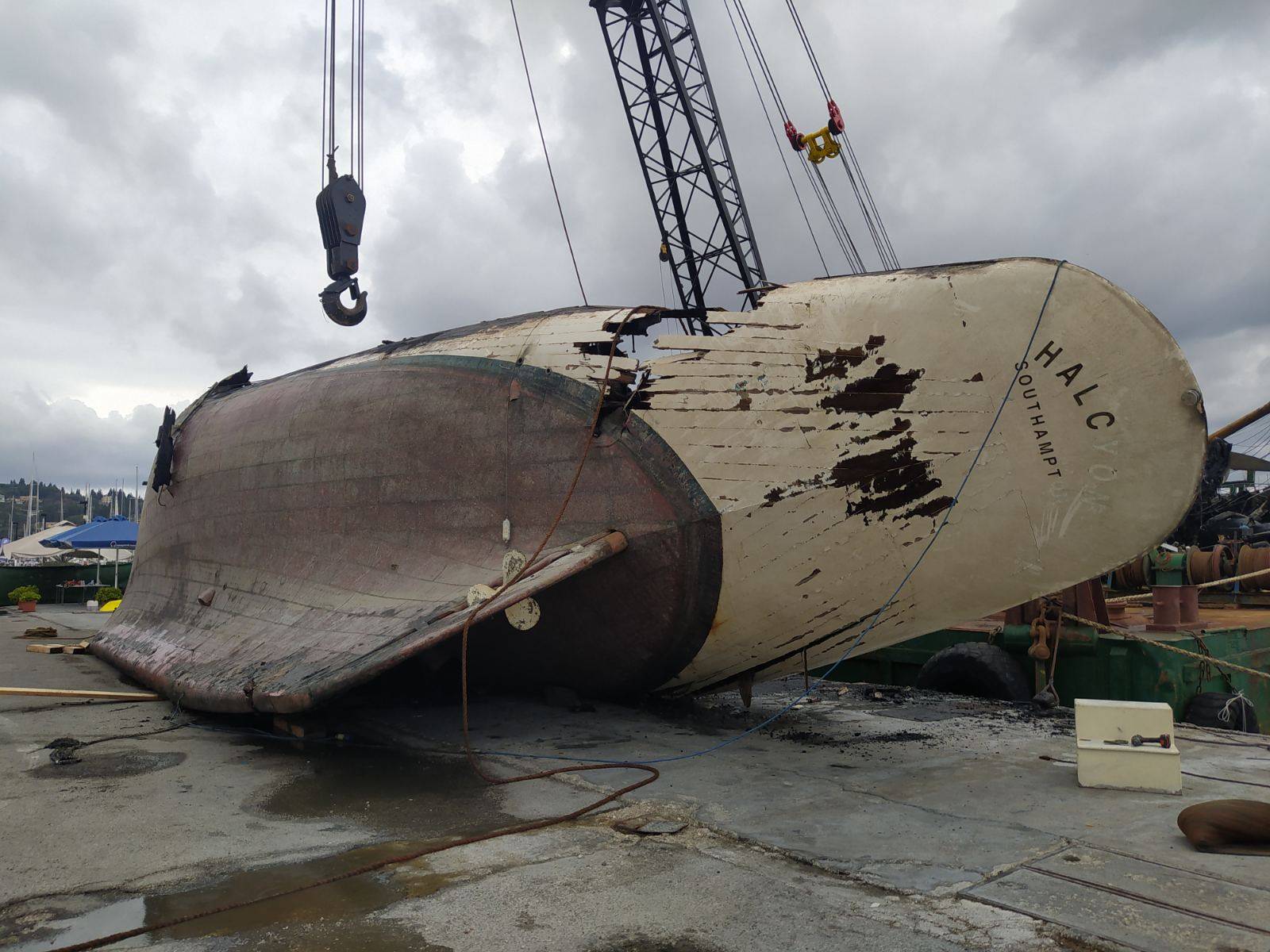 Ανασύρθηκε από το βυθό της μαρίνα των Γουβιών το ιστορικό σκάφος Αλκυών που κάηκε στην πρόσφατη φωτιά με άλλα τρία σύγχρονα πολυεστερικά σκάφη.