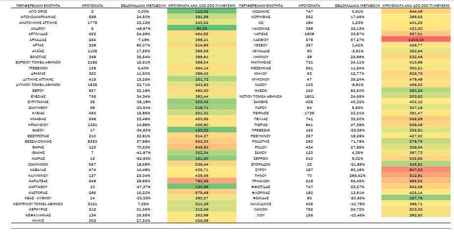 Αναλυτικά, η διασπορά των νέων κρουσμάτων ανά περιφερειακή ενότητα: