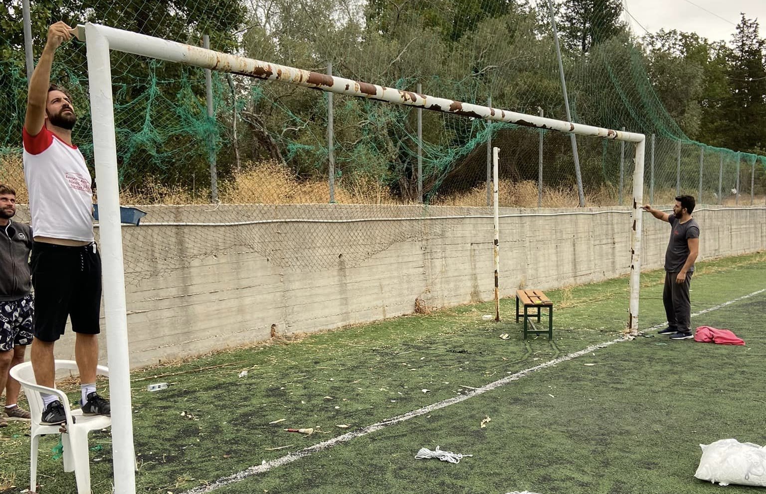 Έτσι τις τελευταίες ημέρες μπήκαν στο γήπεδο και ξεκίνησαν εργασίες (όσες μπορούν)… Μάζεψαν τα αποδυτήρια, έκοψαν τα χόρτα, έβαψαν τα δοκάρια και έβαλαν δίκτυα (ήταν μια χορηγία της ΑΕΦ).