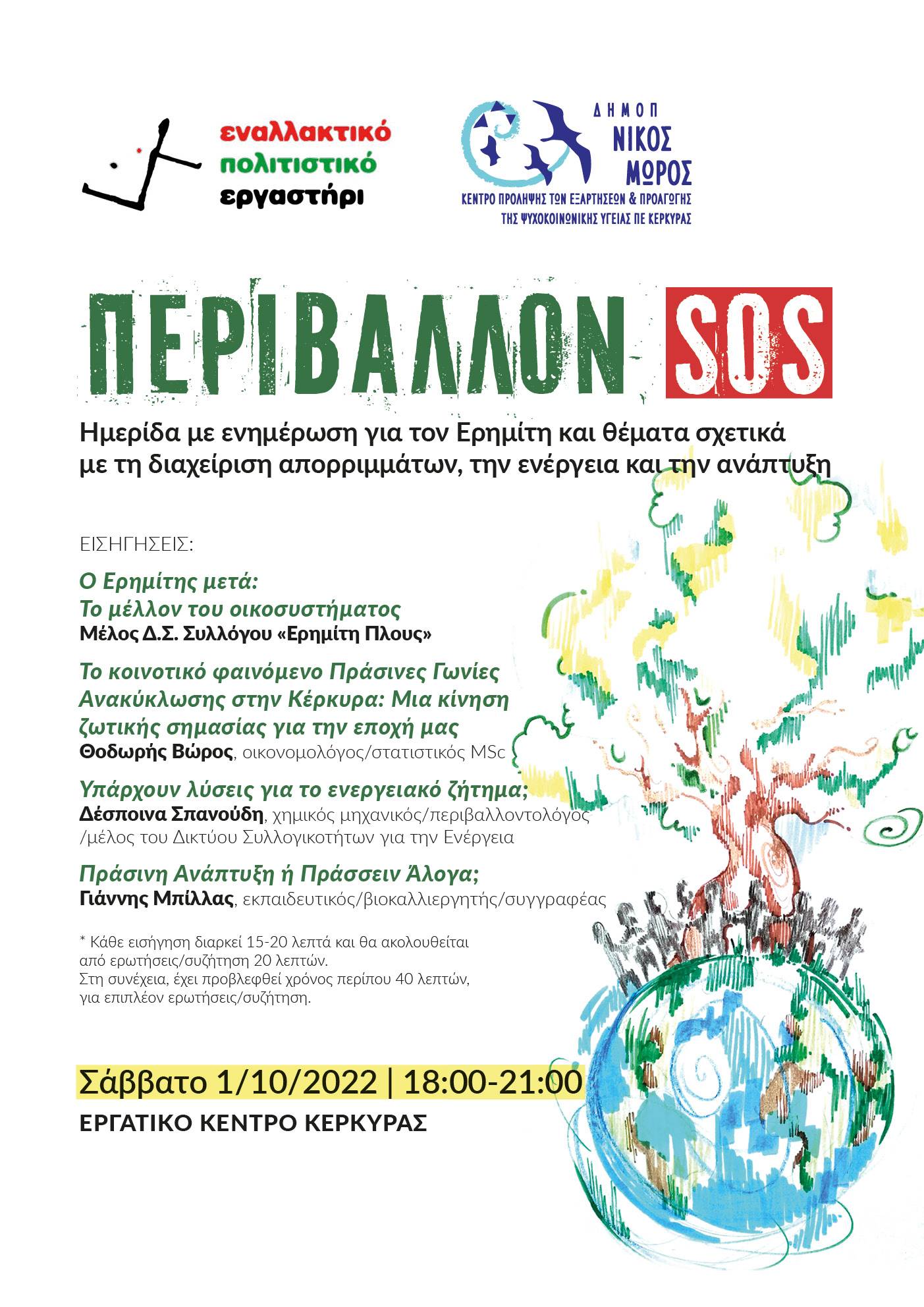 Το Σάββατο 1 Οκτωβρίου 2022, στις 18:00-21:00, στο Εργατικό Κέντρο της Κέρκυρας (Σπύρου Σαμάρα 6), υπό τον γενικό τίτλο Περιβάλλον SOS, το Εναλλακτικό Πολιτιστικό Εργαστήρι και το Κέντρο Πρόληψης Εξαρτήσεων (ΔΗΜΟΠ «ΝΙΚΟΣ ΜΩΡΟΣ») της Κέρκυρας διοργανώνουν ημερίδα ομιλιών και συζητήσεων σχετικά με μια σειρά από επίκαιρα περιβαλλοντικά ζητήματα, τοπικού και ευρύτερου χαρακτήρα.