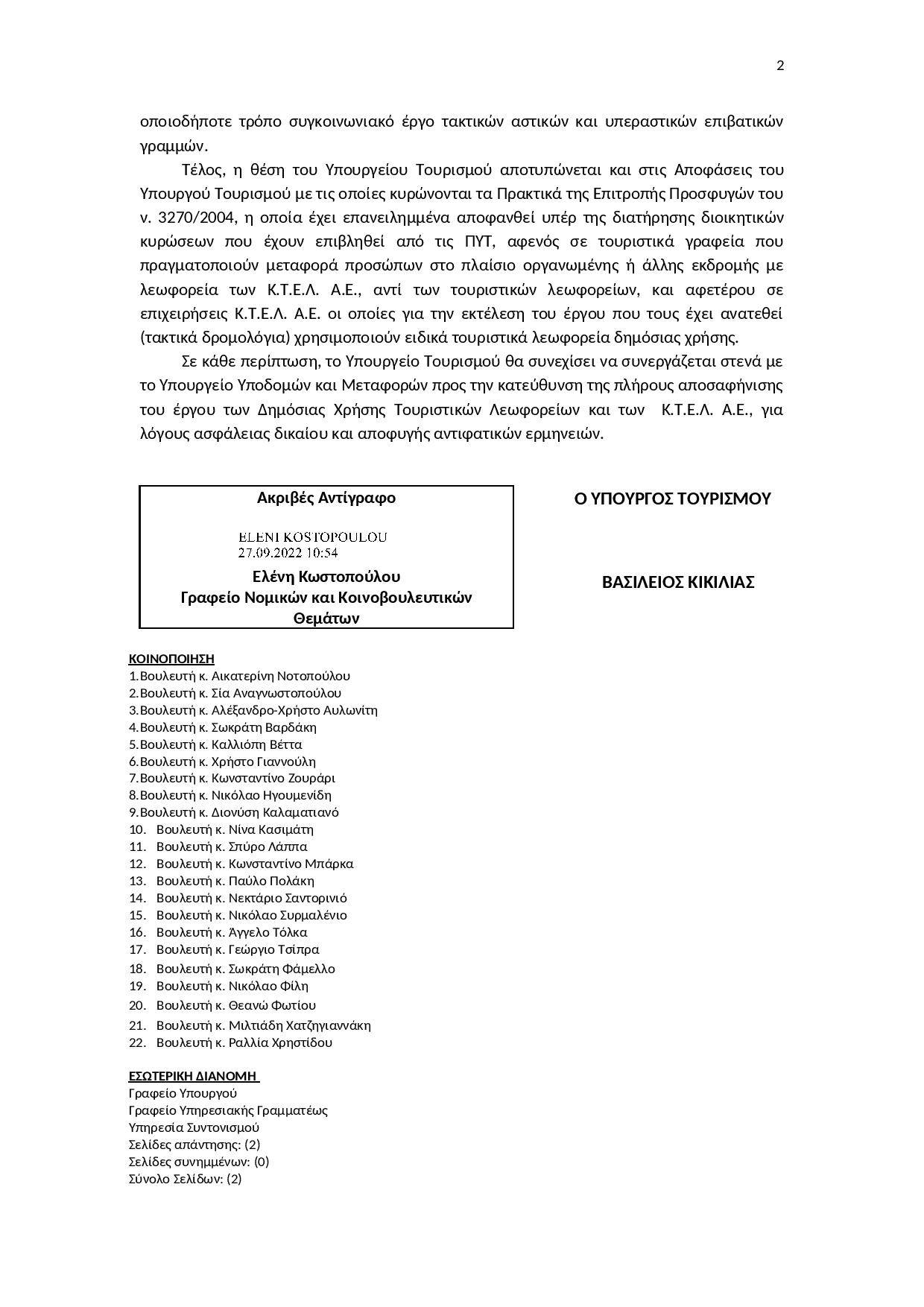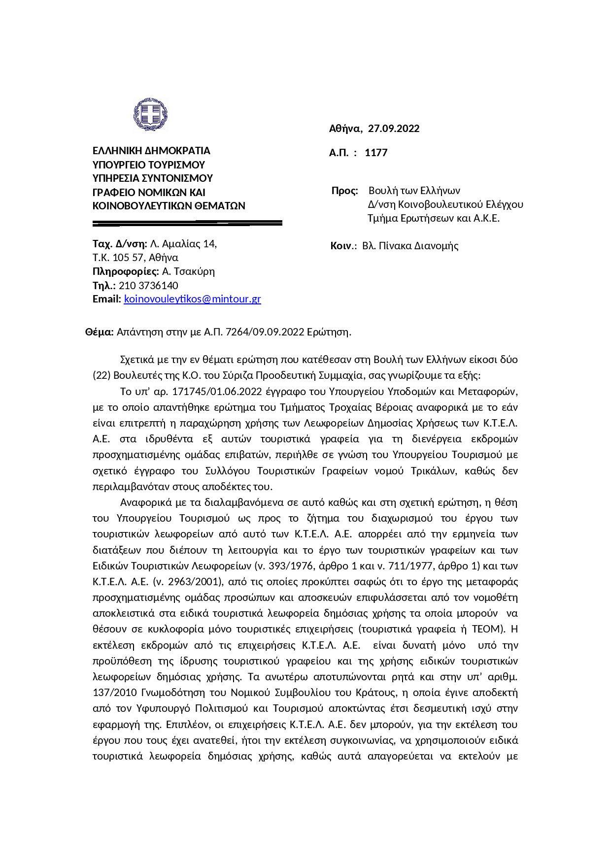 Ύστερα από την ερώτηση, μας απεστάλη η υπ’αριθμ. 1177/27.09.2022 Απάντηση, την οποία υπογράφει ο Υπουργός Τουρισμού. Στο έγγραφο αυτό γίνονται μόνο γενικές αναφορές στο νομοθετικό καθεστώς, καθώς και στις διάφορες ερμηνείες των διατάξεων που διέπουν τη λειτουργία και το έργο των τουριστικών γραφείων και των τουριστικών λεωφορείων. Δεν ζητήσαμε με την ερώτηση μας την επανάληψη των διατάξεων, ζητήσαμε την επίλυση των συνεχών προβλημάτων και την προστασία των δικαιωμάτων των ιδιοκτητών και εργαζομένων στα τουριστικά λεωφορεία.
