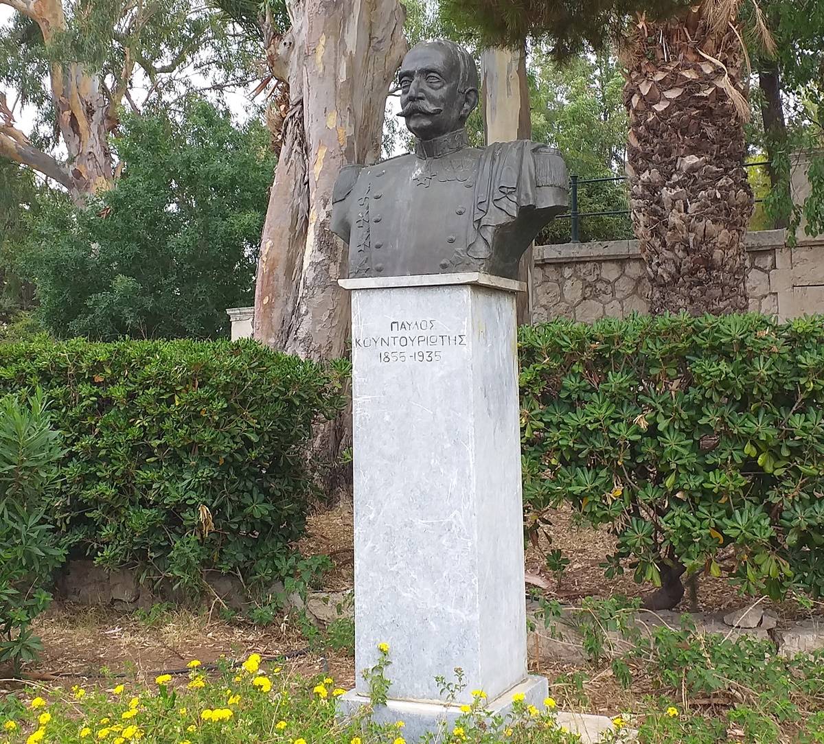 Η περιήγησή μας στα σχετικού θέματος ολόγλυφα έργα, που κοσμούν τους υπαίθριους χώρους της Σχολής Ναυτικών Δοκίμων, ολοκληρώνεται με την προτομή του Παύλου Κουντουριώτη ( 1855 – 1935 ), ναυάρχου του Πολεμικού Ναυτικού, αρχηγού του Β’ Στόλου και ήρωα των Βαλκανικών πολέμων, η οποία απαντά στο τέλος δεξιά όπως κατηφορίζουμε την οδό Αιγαίου. Είναι φιλοτεχνημένη σε ορείχαλκο από τον γλύπτη Ηλία Καντζιλιέρη ( 1947 – 2000 ), το 1989, εκτείνεται σε ικανό μέρος του μπούστου, χωρίς να φέρει βραχίονες και έχει τους ώμους ιδιαίτερα ευρείς.