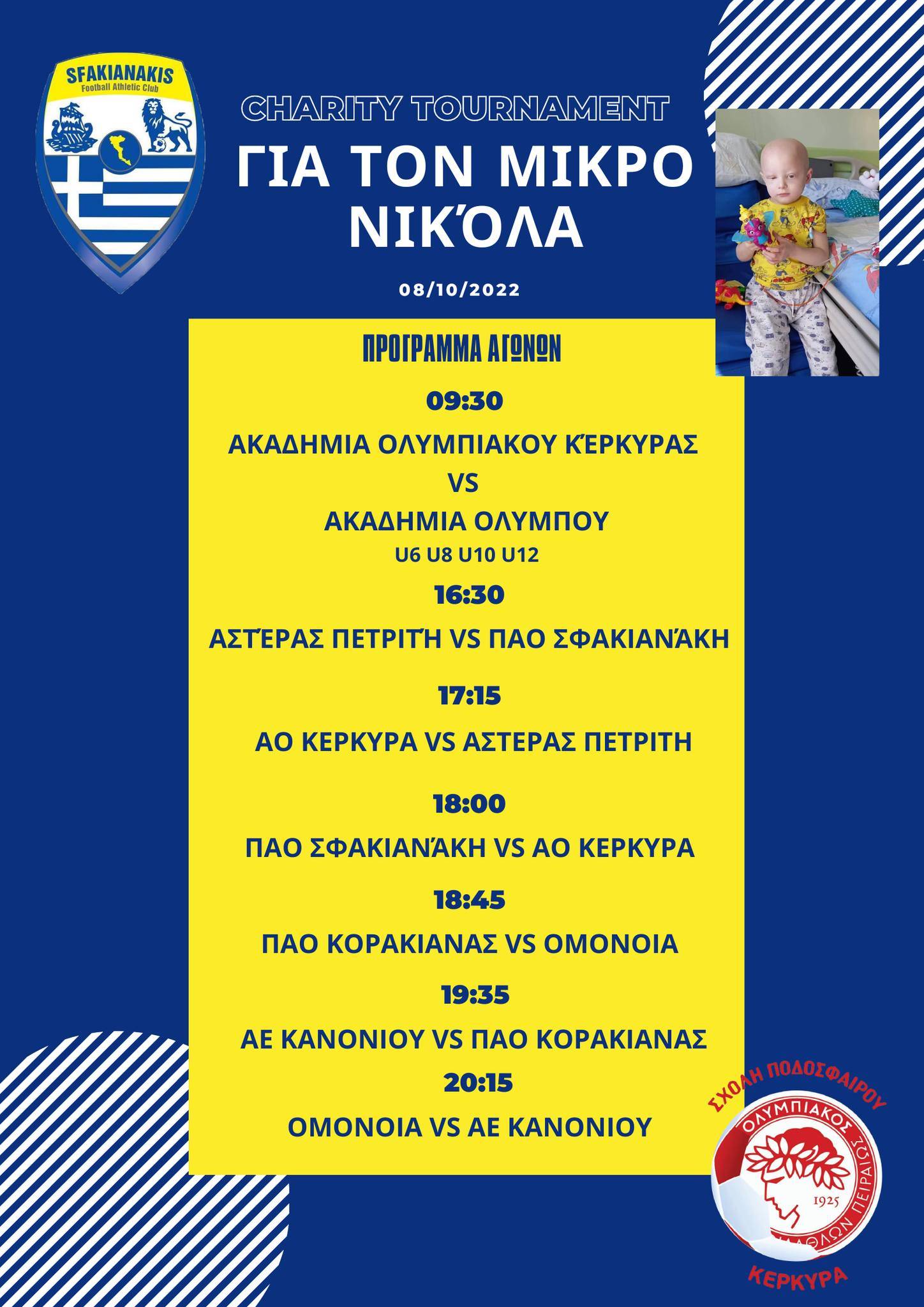 Α.Ε.Κανονιου ) άλλο ένα Charity Tournament θα πραγματοποιηθεί το ερχόμενο Σαββάτο 8 Οκτωβρίου για να βοηθήσουμε όλοι μάς τον μικρό ΝΙΚΟΛΑ (Νίκος Κουρσαρης 3,5 ετών από τη βόρεια κερκυρα δίνει μάχη με τον καρκίνο εδώ και ένα χρόνο. Τον οκτωβριο του 2021 διαγνώστηκε με κακοήθη όγκο στο θώρακα με μετάσταση στα οστά και στο μυελο των οστών – ανθεκτικό νευροβλαστωμα 4ου βαθμού .