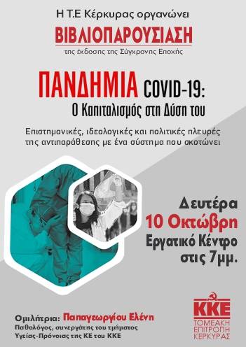 Η έκδοση «Πανδημία COVID-19: Ο καπιταλισμός στη Δύση του», που επιμελήθηκε το Τμήμα Υγείας – Πρόνοιας της ΚΕ του ΚΚΕ και κυκλοφορεί από τις εκδόσεις «Σύγχρονη Εποχή», θα παρουσιαστεί στις 7 το απόγευμα της Δευτέρας 10 Οκτώβρη, στο Εργατικό Κέντρο Κέρκυρας.
