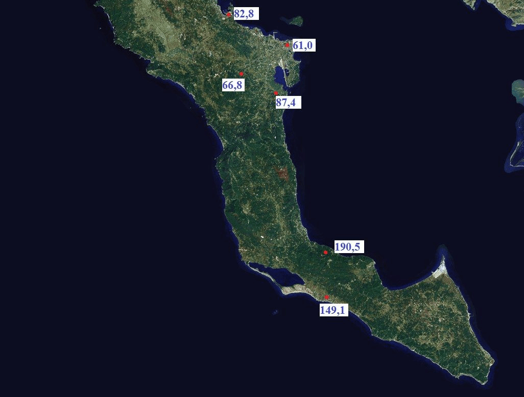Το μεγαλύτερο ύψος βροχής καταγράφηκε στον σταθμό του Χλωμού Κέρκυρας και ήταν ίσο με 190 χιλιοστά.