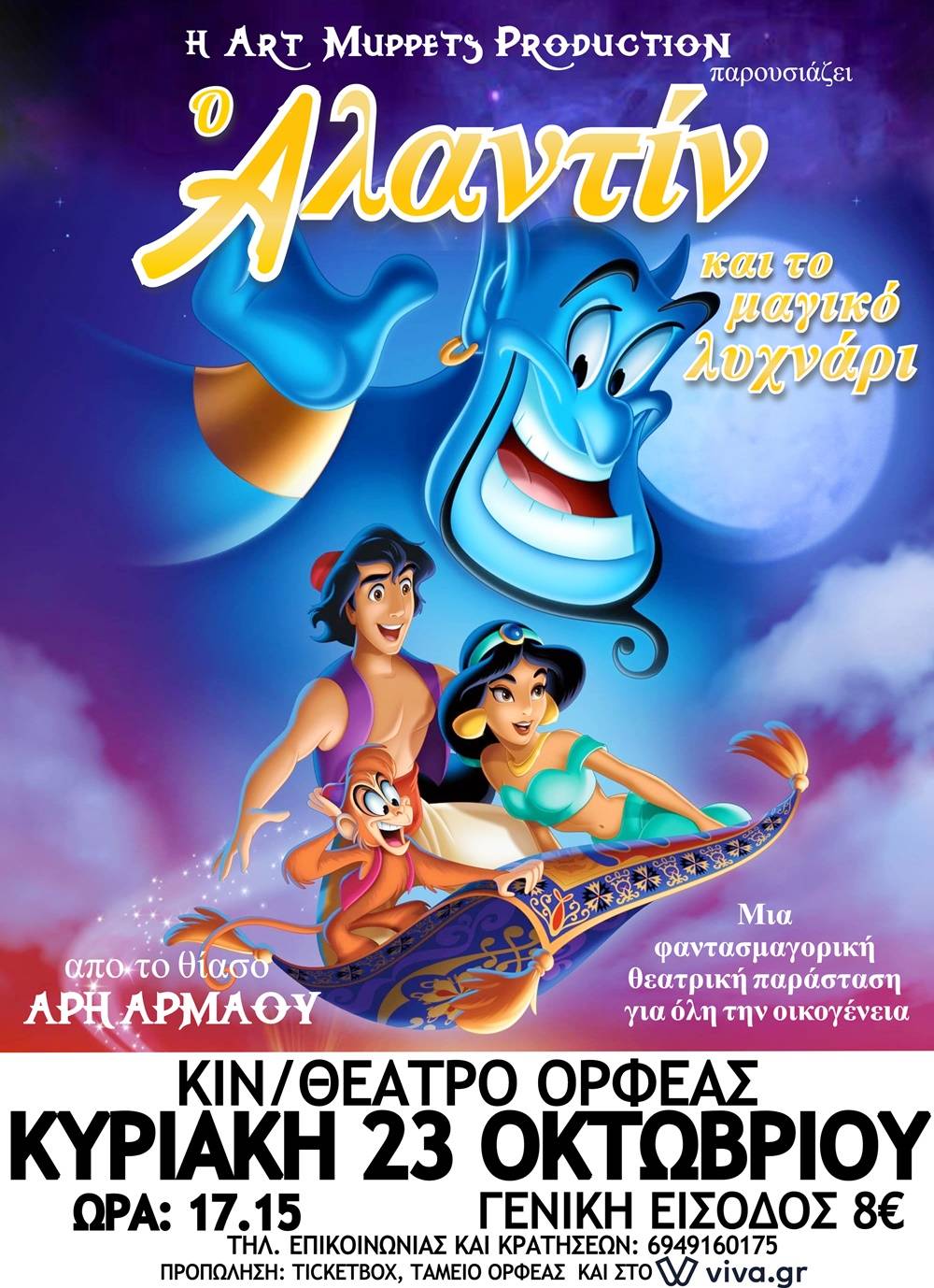 Οι μικροί και μεγάλοι φίλοι του θεάτρου καλούνται να διασκεδάσουν και να ταξιδέψουν στο μαγικό κόσμο του Αλαντίν και της πριγκίπισσας Γιασμίν.