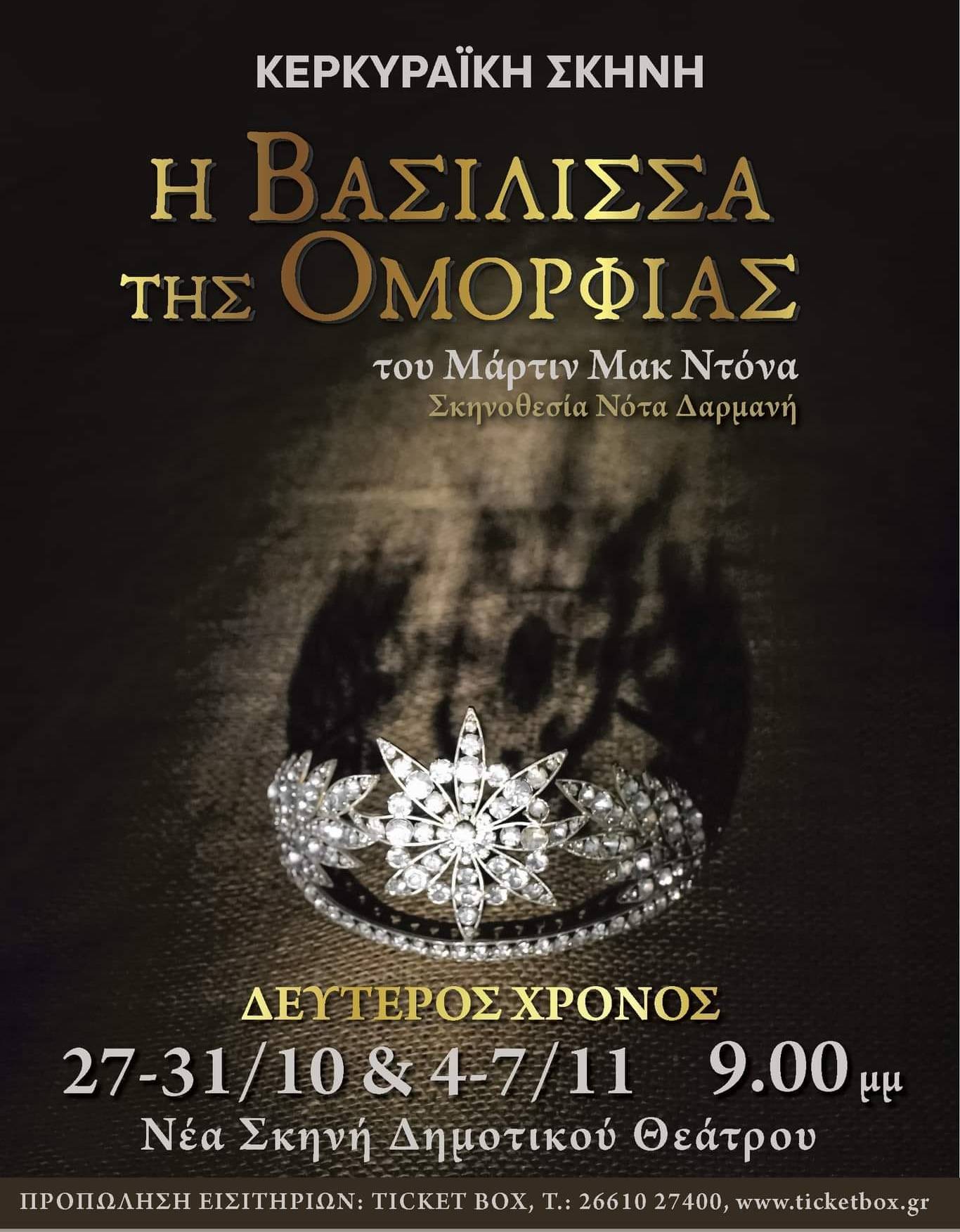 H Κερκυραϊκή Σκηνή παρουσιάζει την παράσταση “Η βασίλισσα της ομορφιάς” του Μάρτιν Μακ Ντόνα σε σκηνοθεσία Νότας Δαρμανή. Για δεύτερη χρονιά το έργο που αγκαλιάστηκε από το κοινό στη Νέα Σκηνή του Δημοτικού Θεάτρου, για το διάστημα 27-31/10/2022 και 4-7/11/2022.