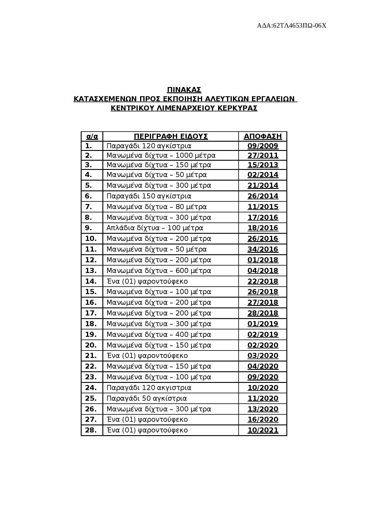 1. Σύμφωνα με το άρθρο 11 παρ. 3 περ. γγ του Π.Δ. 420/1970 «ΑΛΙΕΥΤΙΚΟΣ ΚΩΔΙΚΑΣ» εκτίθενται σε πρόχειρο πλειοδοτικό διαγωνισμό τα κατασχεθέντα αλιευτικά εργαλεία που αναφέρονται στον επισυναπτόμενο στο παρόν πίνακα «ΚΑΤΑΣΧΕΜΕΝΩΝ ΑΛΙΕΥΤΙΚΩΝ ΕΡΓΑΛΕΙΩΝ ΚΕΝΤΡΙΚΟΥ ΛΙΜΕΝΑΡΧΕΙΟΥ ΚΕΡΚΥΡΑΣ».