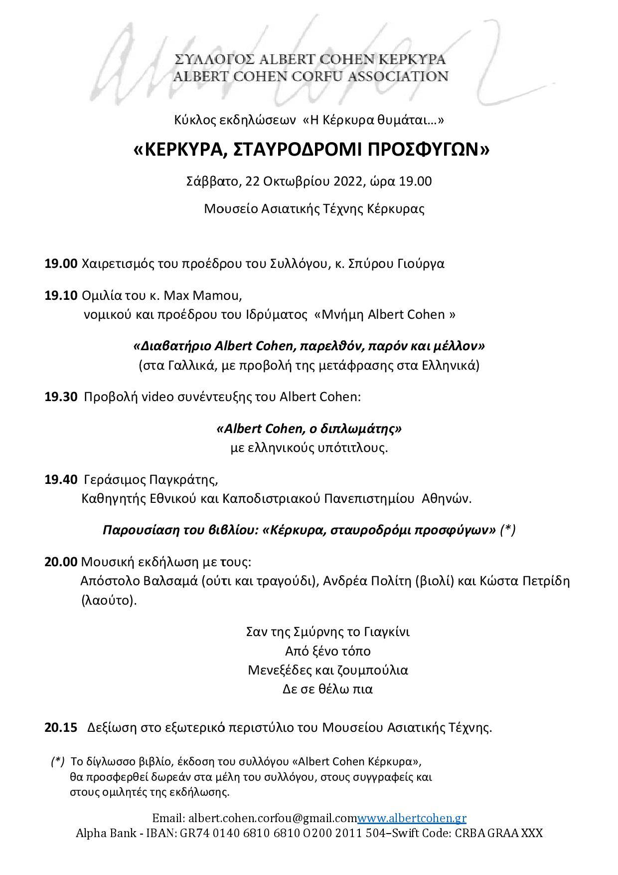 Mε την ευκαιρία της θλιβερής επετείου των 100 ετών της Μικρασιατικής Καταστροφής, ο σύλλογoς “Albert Cohen Κέρκυρα” διοργανώνει εκδήλωση μνήμης με τίτλο: “Κέρκυρα, σταυροδρόμι προσφύγων” το Σάββατο 22 Οκτωβρίου 2022, ώρα 19.00, στο Μουσείο Ασιατικής Τέχνης Κέρκυρας.