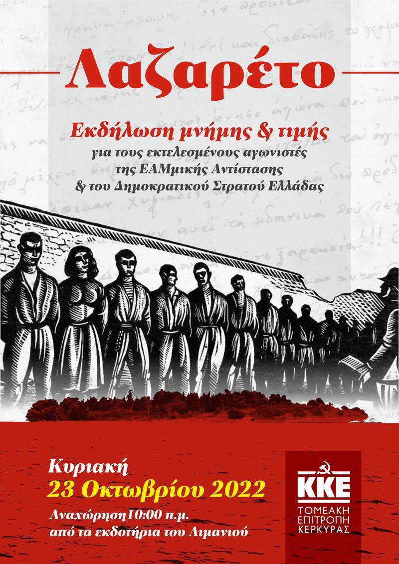 Η Τομεακή Επιτροπή Κέρκυρας του ΚΚΕ και το Τομεακό Συμβούλιο Κέρκυρας της ΚΝΕ, διοργανώνουν την Κυριακή 23 Οκτωβρίου 2022, εκδήλωση μνήμης και τιμής των εκτελεσμένων στο Λαζαρέτο, αγωνιστών της ΕΑΜικής Εθνικής Αντίστασης και του Δημοκρατικού Στρατού Ελλάδας.