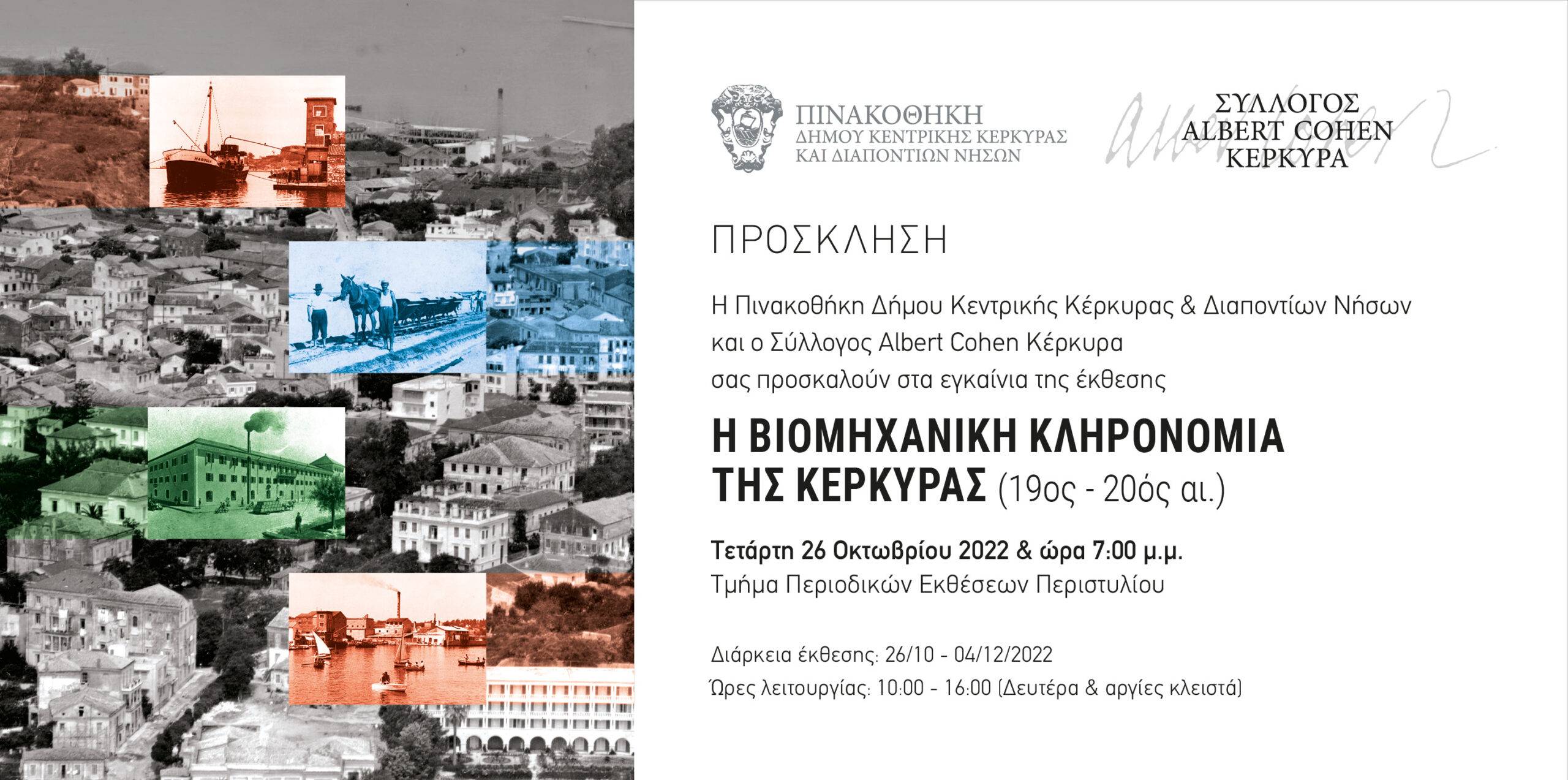 Η Πινακοθήκη Δήμου Κεντρικής Κέρκυρας & Διαποντίων Νήσων σε συνεργασία με το Σύλλογο Albert Cohen Κέρκυρα παρουσιάζουν την έκθεση “Η Βιομηχανική Κληρονομιά της Κέρκυρας, 19ος – 20ός αιώνας”.