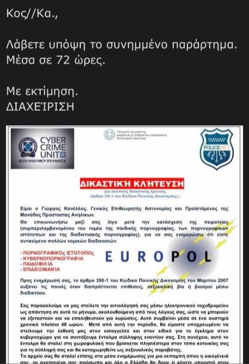 Στη συγκεκριμένη περίπτωση οι δράστες στην προσπάθειά τους να εξαπατήσουν συμπολίτες μας – χρήστες του διαδικτύου χρησιμοποιούν τα στοιχεία του Γενικού Επιθεωρητή Αστυνομίας Νοτίου Ελλάδας, Αντιστράτηγου Γεώργιου Κανέλλου, σε επιστολή που φέρει λογότυπα της Διεύθυνσης Δίωξης Ηλεκτρονικού Εγκλήματος, του Υπουργείου Δικαιοσύνης και ενημερωτικού ιστότοπου, επιχειρώντας να δημιουργήσουν την εντύπωση ότι προέρχεται από την Ελληνική Αστυνομία.