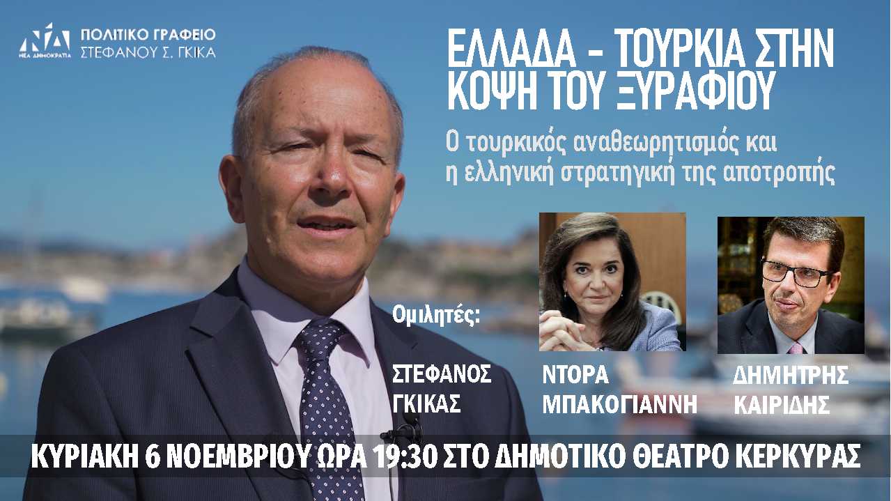 Εκδήλωση με θέμα “Ελλάδα-Τουρκία, στην κόψη του ξυραφιού” διοργανώνει την Κυριακή, στις 7.30 το βράδυ, στο δημοτικό θέατρο ο βουλευτής της ΝΔ Στέφανος Γκίκας.