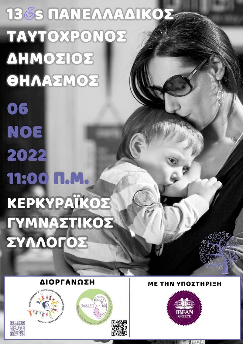 Στο πλαίσιο του εορτασμού της Παγκόσμιας Εβδομάδας Μητρικού Θηλασμού*, το Πανελλήνιο Δίκτυο Εθελοντικών Ομάδων Υποστήριξης Μητρικού Θηλασμού και Μητρότητας, την Κυριακή 6 Νοεμβρίου 2022, διοργανώνει τον 13o Πανελλαδικό Ταυτόχρονο Δημόσιο Θηλασμό.