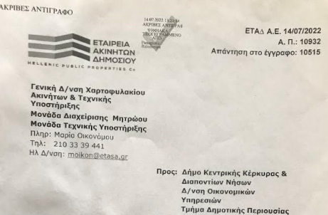 Η επιστολή της φέρει ημερομηνία 14 Ιουλίου 2022, έχει αποδέκτη τον κεντρικό Δήμο του νησιού και αναγνωρίζει, αποδέχεται και συμφωνεί επί του πρακτέου ότι σύμφωνα με τον νόμο 4049/2012 το διοικητικό συμβούλιο της ΕΤΑΔ οφείλει να λάβει και θα λάβει και θα αποστείλει στον Δήμο απόφαση με το – αναγκαίο για τη μεταγραφή της κυριότητας της νησίδας στον κερκυραϊκό Δήμο- Πρακτικό. Δεν την υπογράφει ο διευθύνων σύμβουλος, επικεφαλής της εταιρείας κ. Στέφανος Βλαστός, αλλά με τη σύμφωνη γνώμη του, ως είθισται, η αρμόδια Γενική Διεύθυνση Χαρτοφυλακίου Ακινήτων της ΕΤΑΔ.