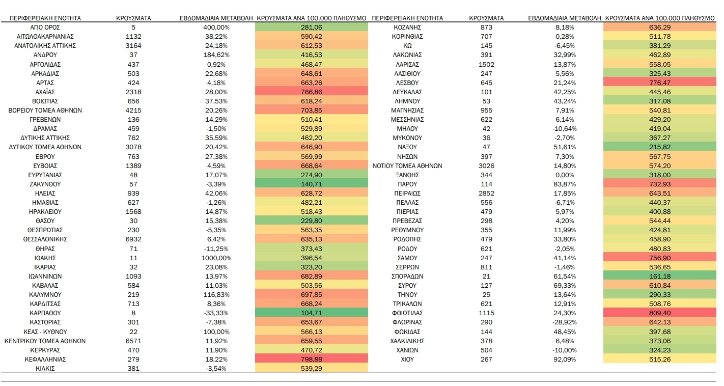 Στα 61.139 ανέρχονται τα συνολικά κρούσματα για την εβδομάδα 31 Οκτωβρίου – 06 Νοεμβρίου σύμφωνα με την εβδομαδιαία επιδημιολογική έκθεση της πανδημίας κορονοϊού που ανακοίνωσε σήμερα, Τρίτη 08/11 ο ΕΟΔΥ, ενώ οι νεκροί έφτασαν τους 134 και οι διασωληνωμένοι τους 89.