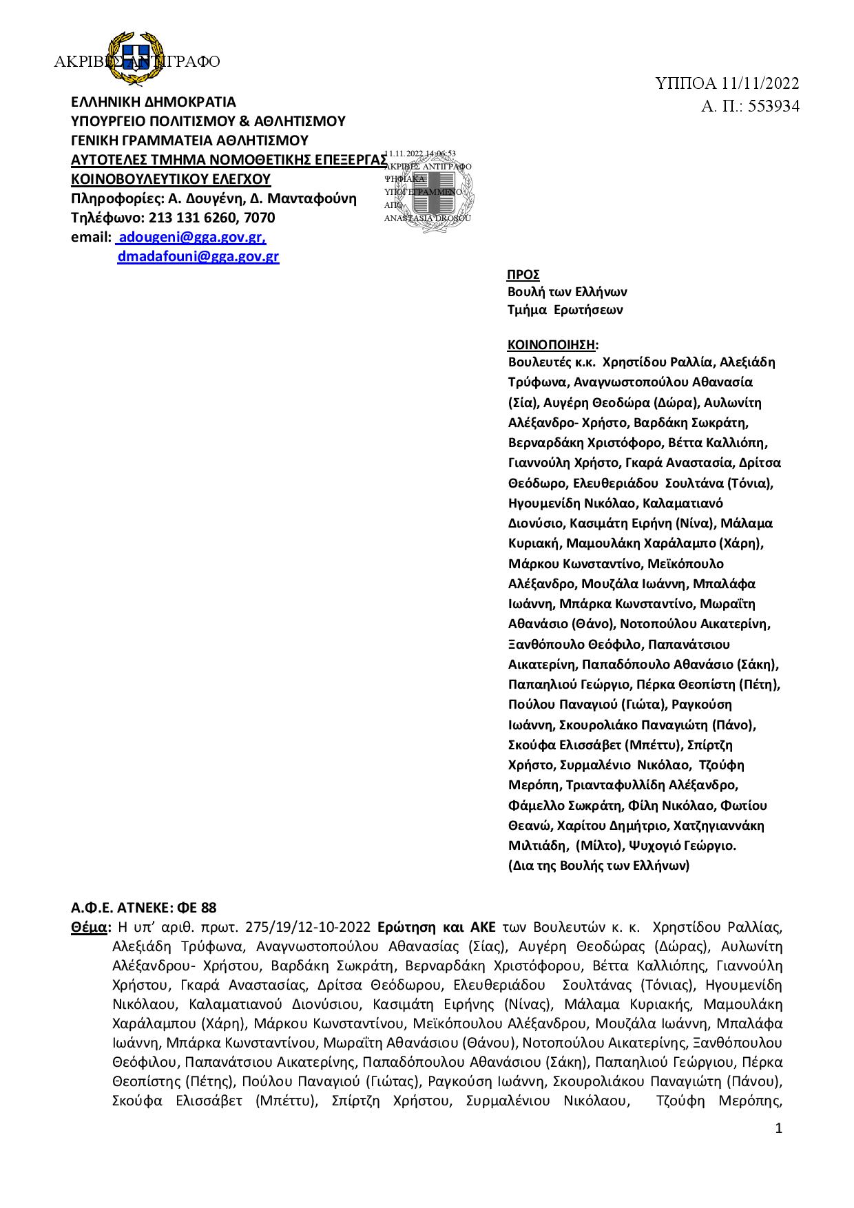 Την 12η Οκτωβρίου 2022, σαράντα δύο βουλευτές του ΣΥΡΙΖΑ-Προοδευτική Συμμαχία καταθέσαμε ερώτηση προς την Υπουργό Πολιτισμού με πρωτοβουλία της βουλεύτριας Ν.Τομέα Αθήνας του ΣΥΡΙΖΑ-ΠΣ Ραλλίας Χρηστίδου και συνυπογραφή του βουλευτή Κέρκυρας και Αν.Τομεάρχη Τουρισμού ΚΟ ΣΥΡΙΖΑ-ΠΣ Αλέξανδρου Αυλωνίτη, αναφορικά με την κατανομή κονδυλίων του ερασιτεχνικού αθλητισμού στα αθλητικά σωματεία και τις αθλητικές ομοσπονδίες.