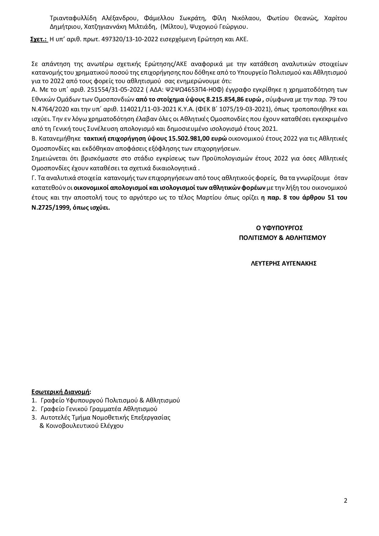 Ύστερα από την ερώτηση, μας απεστάλη η υπ’αριθμ. 553937/2022 Απάντηση, την οποία υπογράφει ο Υφυπουργός Αθλητισμού. Στην μονοσέλιδη απάντηση του Υπουργείου, γίνονται λακωνικές αναφορές για το ύψος των κονδυλίων που υποτίθεται έχουν διατεθεί σε αθλητικά σωματεία και ομοσπονδίες . Δεν ζητήσαμε με την ερώτηση μας απλά και μόνο την αποτύπωση αριθμών, ζητήσαμε από την Υπουργό αν έχει ελέγξει κατά πόσον τα χρήματα, που προορίζονταν για τη προετοιμασία και την υποστήριξη των αθλητών, έφτασαν στον προορισμό τους και αξιοποιήθηκαν πραγματικά.