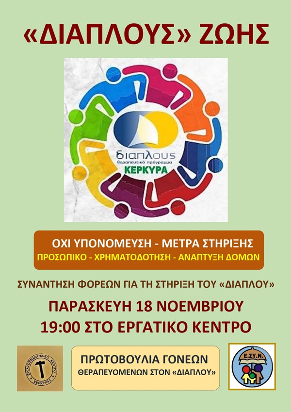 Tην Παρασκευή 18 Νοεμβρίου στις 19:00 θα πραγματοποιηθεί στο εργατικό κέντρο με πρωτοβουλία του Εθνικού Συμβουλίου κατά των Ναρκωτικών (ΕΣΥΝ), του Εργατικού Κέντρου Κέρκυρας και Γονέων θεραπευμένων παιδιών στον ΔΙΑΠΛΟΥ ευρεία σύσκεψη φορέων για τη στήριξη του προγράμματος απεξάρτησης ΔΙΑΠΛΟΥΣ.