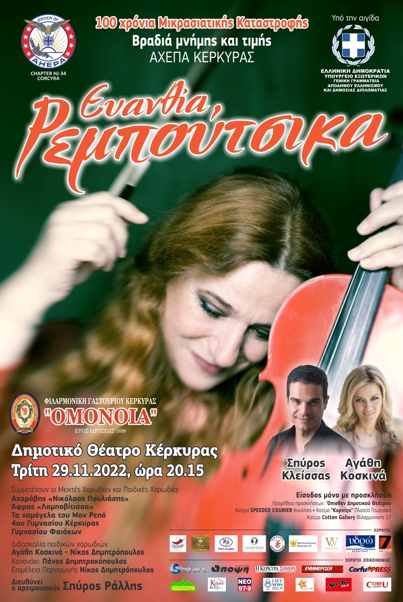 Η σπουδαία μουσικοσυνθέτρια και βιολίστρια Ευανθία Ρεμπούτσικα, έχοντας μαζί της τους ερμηνευτές της Σπύρο Κλείσσα και Αγάθη Κοσκινά, αποδεχόμενη τη πρόταση του τμήματος AHEPA, HJ-34 Corcyra, συμπράττει σε μια πολλά υποσχόμενη παράσταση με τη φιλαρμονική ‘Ομόνοια’ Γαστουρίου και τη συμμετοχή των μεικτών και παιδικών χορωδιών Αχαράβης και Άφρας καθώς και τις μαθητικές χορωδίες του 4ου γυμνασίου, του γυμνασίου Φαιάκων και ‘τα χαμόγελα του Μον Ρεπό’.