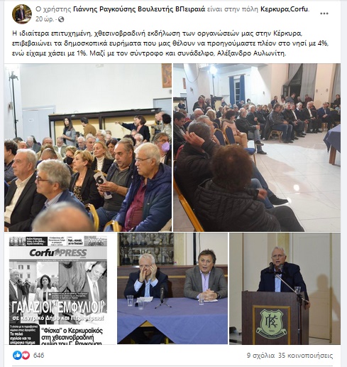Ο εκπρόσωπος τύπου του ΣΥΡΙΖΑ, Γιάννης Ραγκούσης, ανάρτησε στη σελίδα του στο facebook φωτογραφικό υλικό, καθώς και το πρωτοσέλιδο της κυριακάτικης CorfuPress.com με αφορμή την παρουσία του στην εκδήλωση του κόμματος στο νησί.