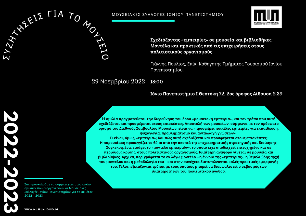 Τρίτη 29 Νοεμβρίου 2022 στις 18:00, στο Ιόνιο Πανεπιστήμιο, Ι. Θεοτόκη 72, 2ος όροφος Αίθουσα 2.39.